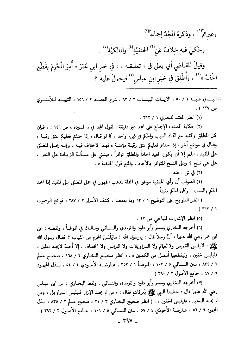 2 حكاية للمصنف الإجماع على المجد غير دقيقة، أقول المجد في "السودة" ص 146: فإن كان المطلق والمقيد مع اتحاد السبب والحكم في شيء واحد، كما لو قال "إذا حنثتم فعليكم عتق الرقبة" وقال في موضع آخر "إذا حنثتم فعليكم عتق رقبة مؤمنة" فهذا لاخلاف فيه، وإنه يحمل المطلق على المقيد، اللهم أن لا يكون المقيد آحاداً والمطلق تواتراً، فينبني على مسألة الزيادة على النص، هل هي نسخ؟ وعلى النسخ للتواتر بالأحاد، والمنع قول الحنفية".