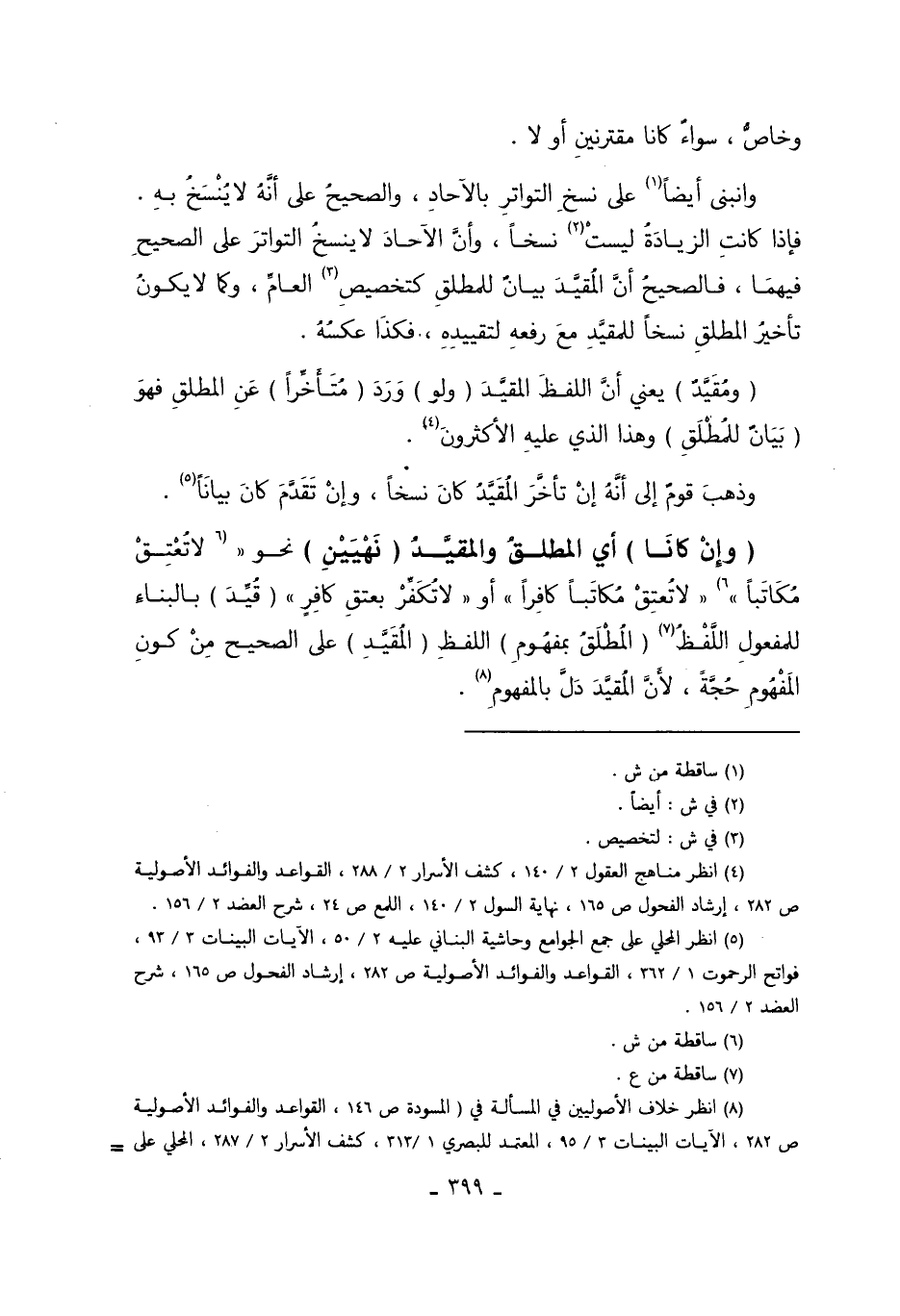 4 انظر مناهج العقول 2/140، كشف الأسرار2/288، القواعد والفوائد الأصولية ص282، إرشاد الفحول ص165، نهاية السول 2/140، اللمع ص24، شرح العضد 2/156.