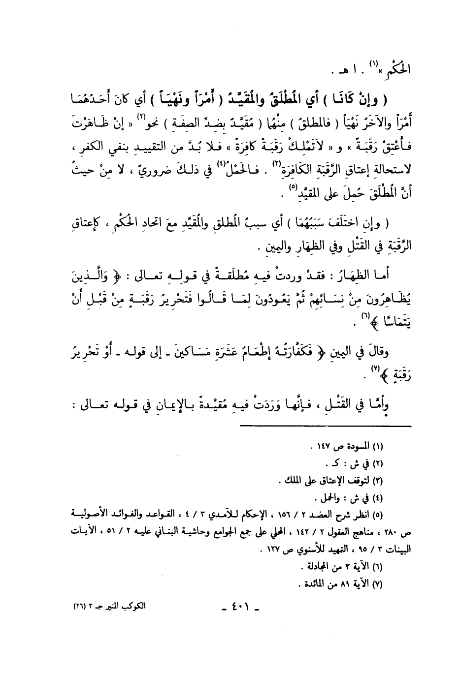"وَإِنْ كَانَا" أَيْ الْمُطْلَقُ وَالْمُقَيَّدُ "أَمْرًا وَنَهْيًا" أَيْ كَانَ أَحَدُهُمَا أَمْرًا وَالآخَرُ نَهْيًا "فَالْمُطْلَقُ" مِنْهُمَا "مُقَيَّدٌ بِضِدِّ الصِّفَةِ" 2كَإِنْ ظَاهَرْتَ فَأَعْتِقْ رَقَبَةً، وَلا تَمْلِكْ رَقَبَةً كَافِرَةً فَلا بُدَّ مِنْ التَّقْيِيدِ بِنَفْيِ الْكُفْرِ، لاسْتِحَالَةِ إعْتَاقِ الرَّقَبَةِ الْكَافِرَةِ3, وَالْحَمْلُ4 فِي ذَلِكَ ضَرُورِيٌّ، لا مِنْ حَيْثُ إنَّ الْمُطْلَقَ حُمِلَ عَلَى الْمُقَيَّدِ5.