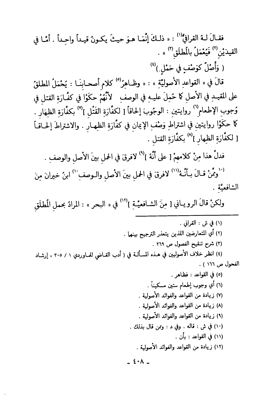 فَقَالَ لَهُ الْقَرَافِيُّ1: ذَلِكَ إنَّمَا هُوَ حَيْثُ يَكُونُ قَيْدًا وَاحِدًا أَمَّا فِي الْقَيْدَيْنِ2 فَيُعْمَلُ بِالْمُطْلَقِ3