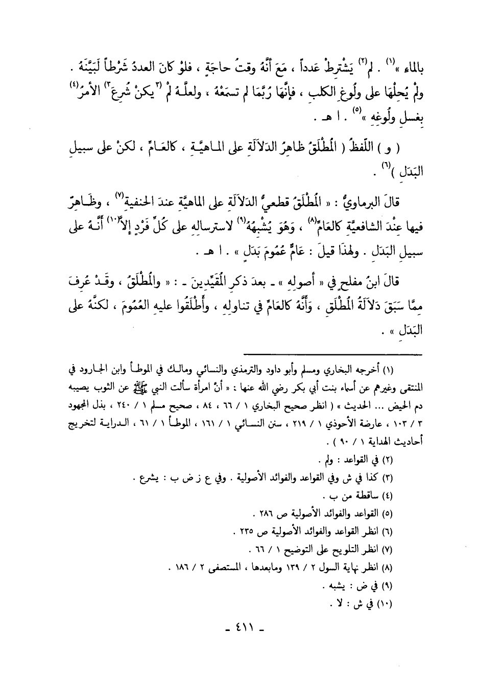 قَالَ الْبِرْمَاوِيُّ: الْمُطْلَقُ قَطْعِيُّ الدَّلالَةِ عَلَى الْمَاهِيَّةِ عِنْدَ الْحَنَفِيَّةِ7، وَظَاهِرٌ فِيهَا عِنْدَ الشَّافِعِيَّةِ كَالْعَامِّ8, وَهُوَ يُشْبِهُهُ9 لاسْتِرْسَالِهِ عَلَى كُلِّ فَرْدٍ، إلاَّ10 أَنَّهُ عَلَى سَبِيلِ الْبَدَلِ, وَلِهَذَا قِيلَ: عَامٌّ عُمُومَ بَدَلٍ. اهـ.