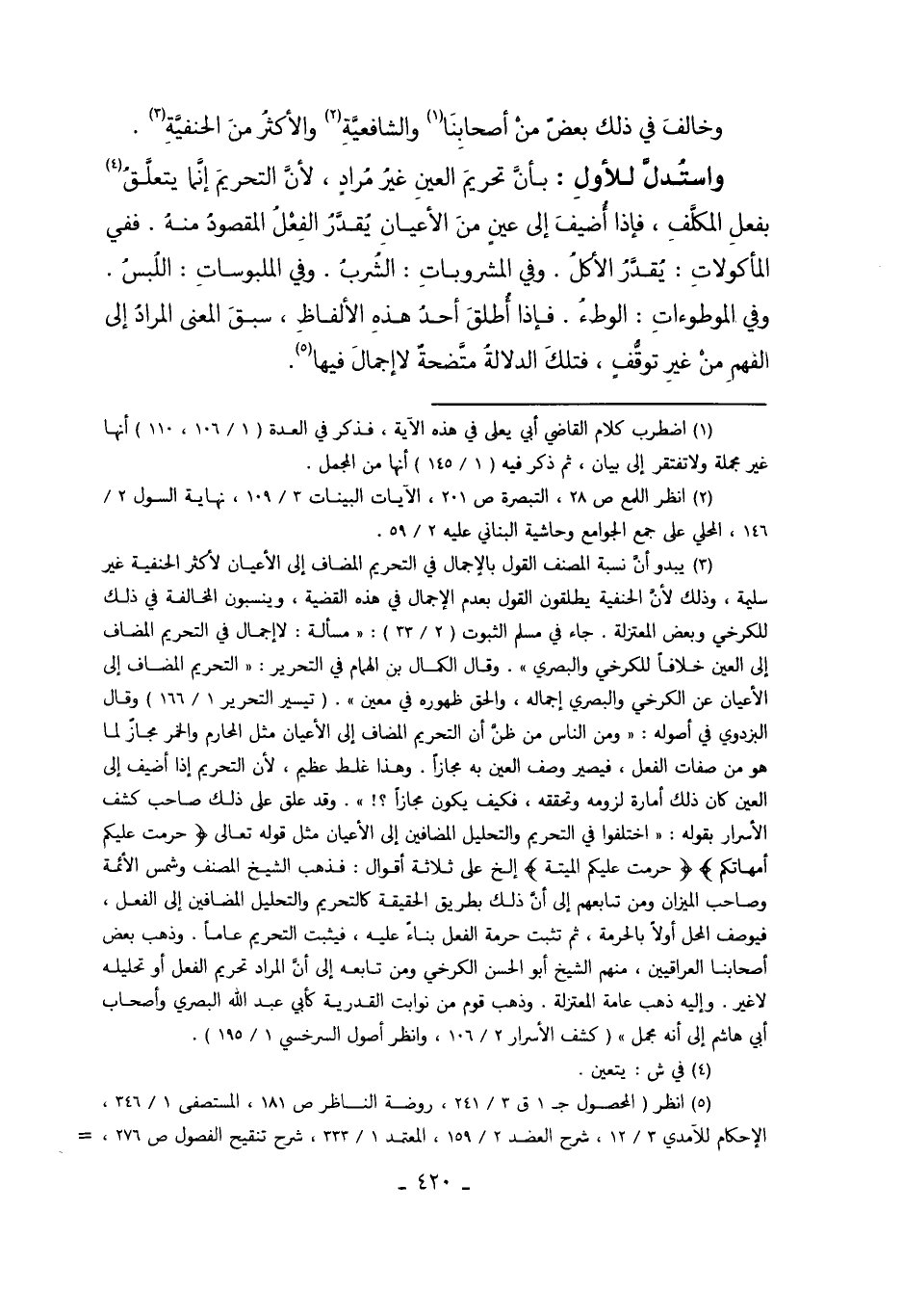 3 يبدو أن نسبة المصنف القول بالإجمال في التحريم المضاف إلى الأعيان لأكثر الحنفية غير سليمة، وذلك لأن الحنفية يطلقون القول بعدم الإجمال في هذه القضية، وينسبون المخالفة في ذلك للكرخي وبعض المعتزلة. جاء في مسلم الثبوت"2/23": "مسألة: لا إجمال في التحريم المضاف إلى العين خلافاً للكرخي والبصري". وقال الكمال بن الهمام في التحرير: "التحريم المضاف إلى الأعيان عن الكرخي والبصري إجماله، والحق ظهوره في معين". "تيسير التحرير 1/166" وقال البزدوي في أصوله: "ومن الناس ظن أن التحريم المضاف إلى الأعيان مثل المحارم والخمر مجاز لما هو من صفات الفعل، فيصير وصف العين به مجازاً. وهذا غلط عظيم، لأن التحريم إذا أضيف إلى العين كان ذلك أمارة لزومه وتحققه، فكيف يكون مجازاً؟! ". وقد علق على ذلك صاحب كشف الأسرار بقوله: "اختلفوا في التحريم والتحليل المضافين إلى الأعيان مثل قوله تعالى: {حُرِّمَتْ عَلَيْكُمْ أُمَّهَاتُكُمْ} {حُرِّمَتْ عَلَيْكُمُ الْمَيْتَةُ} إلخ على ثلاثة قوال: فذهب الشيخ المصنف وشمس الأئمة وصاحب الميزان ومن تابعهم إلى أن ذلك بطريق الحقيقة كالتحريم والتحليل المضافين إلى الفعل، فيوصف المحل أولاً بالحرمة، ثم تثبت حرمة الفعل بناءً عليه، فيثبت التحريم عاماً. وذهب بعض أصحابنا العراقيين، منهمالشيخ أبو الحسن الكرخي ومن تابعه إلى أن المراد تحريم الفعل أو تحليله لاغير. وإليه ذهب عامة المعتزلة. وذهب قوم من نوابت القدرية كأبي عبد الله البصري وأصحاب أبي هاشم إلى أنه مجمل" " كشف الأسرار 2/106، وانظر أصول السرخسي 1/195".