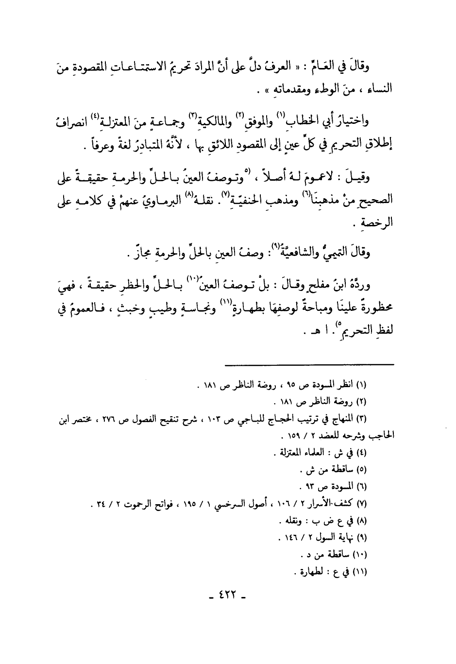 وَقَالَ فِي الْعَامِّ: الْعُرْفُ دَلَّ عَلَى أَنَّ الْمُرَادَ تَحْرِيمُ الاسْتِمْتَاعَاتِ الْمَقْصُودَةِ مِنْ النِّسَاءِ، مِنْ الْوَطْءِ وَمُقَدَّمَاتِهِ.