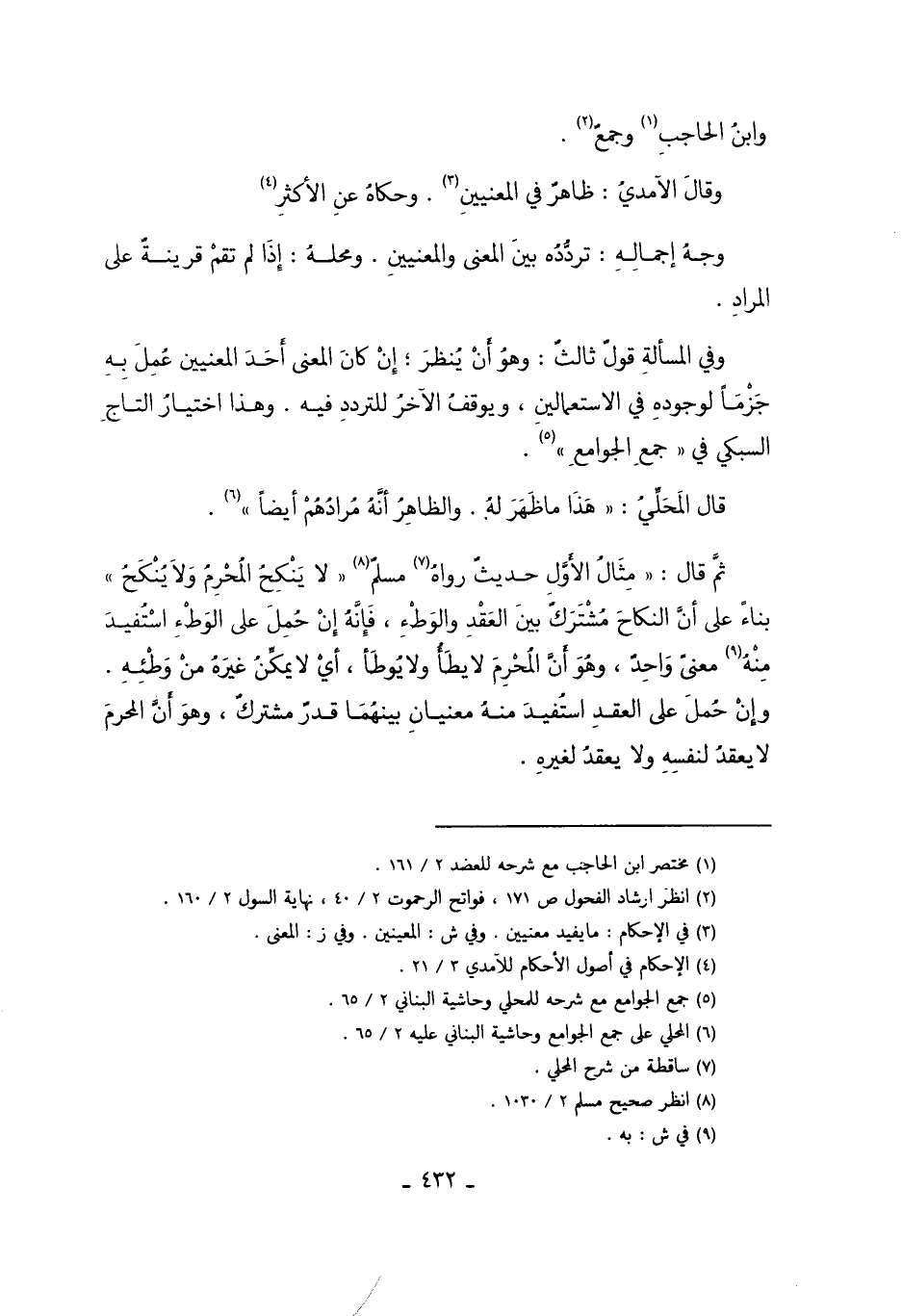 ثُمَّ قَالَ: مِثَالُ الأَوَّلِ: حَدِيثٌ رَوَاهُ7 مُسْلِمٌ8 "لا يَنْكِحُ الْمُحْرِمُ وَلا يُنْكَحُ" بِنَاءً عَلَى أَنَّ النِّكَاحَ مُشْتَرَكٌ بَيْنَ الْعَقْدِ وَالْوَطْءِ, فَإِنَّهُ إنَّ حُمِلَ عَلَى الْوَطْءِ اُسْتُفِيدَ مِنْهُ9 مَعْنًى وَاحِدٌ وَهُوَ أَنَّ الْمُحْرِمَ لا يَطَأُ وَلا يُوطَأُ أَيْ لا يُمَكِّنُ غَيْرَهُ مِنْ وَطْئِهِ, وَإِنْ حُمِلَ عَلَى الْعَقْدِ اُسْتُفِيدَ مِنْهُ مَعْنَيَانِ بَيْنَهُمَا قَدْرٌ مُشْتَرَكٌ، وَهُوَ أَنَّ الْمُحْرِمَ لا يَعْقِدُ لِنَفْسِهِ وَلا يَعْقِدُ لِغَيْرِهِ.