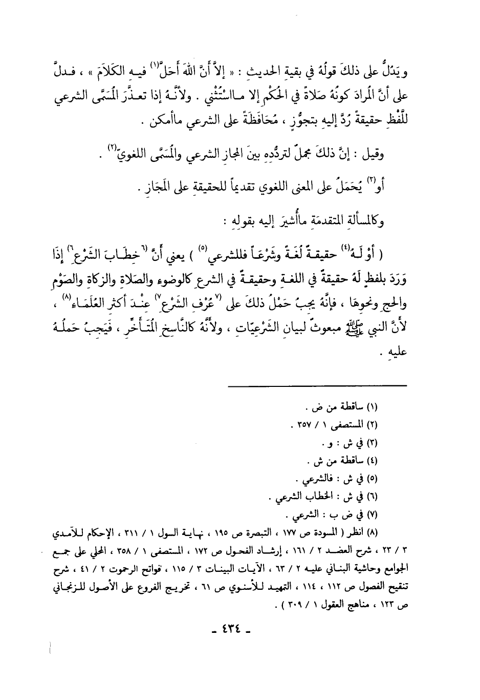 8 انظر" المسودة ص177، التبصرة ص195، نهاية السول 1/311، الإحكام للآمدي 3/23، شرح العضد 2/161، إرشاد الفحول ص172، المستصفى 1/358، المحلي على جمع الجوامع وحاشية البناني عليه 2/63، الآيات البينات 3/115، فواتح الرحموت 2/41، شرح تنقيح الفصول ص 112، 114، التمهيد للأسنوي ص61، تخريج الفروع على الأصول للزنجاني ص123، مناهج العقول 1/309".