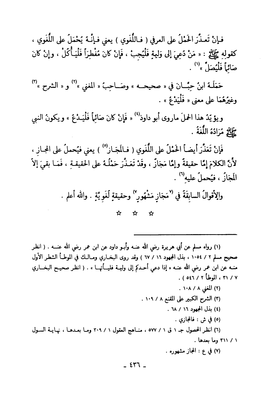 فَإِنْ تَعَذَّرَ أَيْضًا الْحَمْلُ عَلَى اللُّغَوِيِّ "فَالْمَجَازِ5" يَعْنِي فَيُحْمَلُ عَلَى الْمَجَازِ, لأَنَّ الْكَلامَ إمَّا حَقِيقَةٌ وَإِمَّا مَجَازٌ، وَقَدْ تَعَذَّرَ حَمْلُهُ عَلَى الْحَقِيقَةِ، فَمَا بَقِيَ إلاَّ الْمَجَازُ فَيُحْمَلَ عَلَيْهِ6، وَالأَقْوَالُ السَّابِقَةُ فِي7 مَجَازٍ مَشْهُورٍ وَحَقِيقَةٍ لُغَوِيَّةٍ، وَاَللَّهُ أَعْلَمُ.