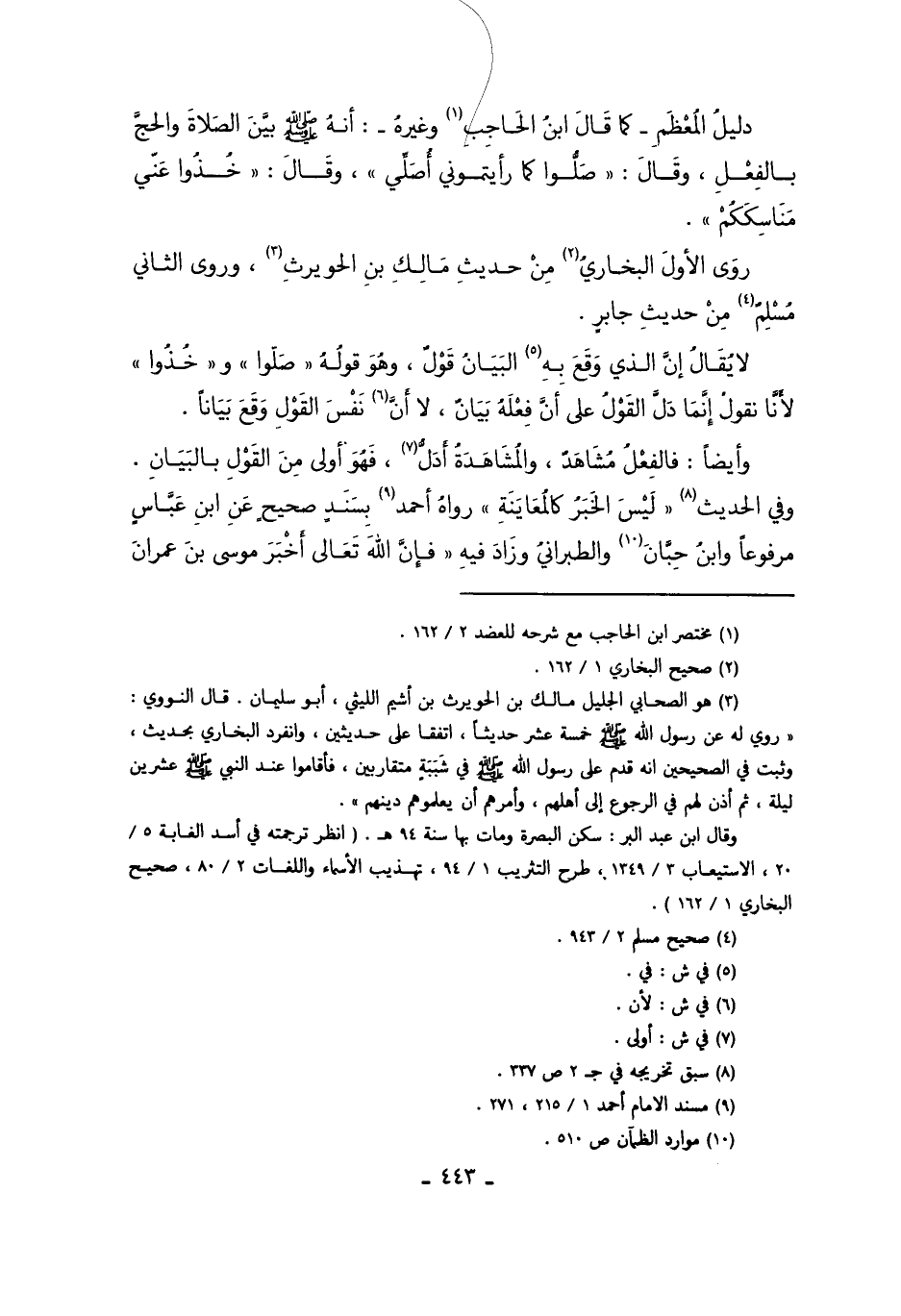 دَلِيلُ الْمُعْظَمِ -كَمَا قَالَ ابْنُ الْحَاجِبِ1 وَغَيْرُهُ -: أَنَّهُ صَلَّى اللَّهُ عَلَيْهِ وَسَلَّمَ بَيَّنَ الصَّلاةَ وَالْحَجَّ بِالْفِعْلِ, وَقَالَ: "صَلُّوا كَمَا رَأَيْتُمُونِي أُصَلِّي" وَقَالَ: "خُذُوا عَنِّي مَنَاسِكَكُمْ".