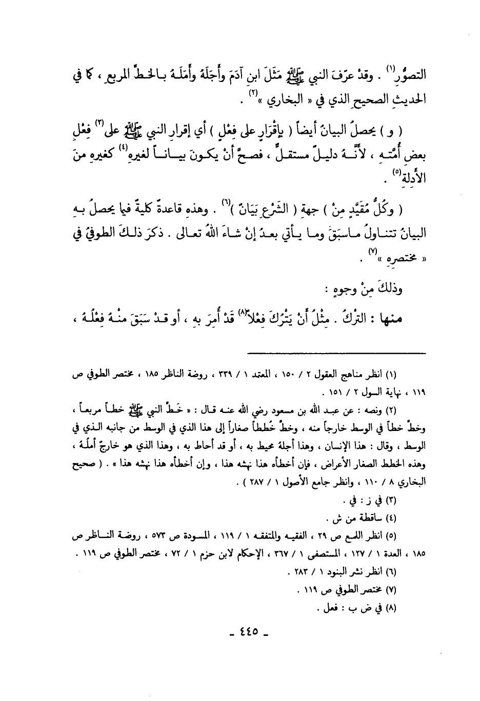 5 انظر اللمع ص29، الفقيه والمتفقه 1/119، المسودة ص573، روضة الناظر ص185، العدة 1/127، المستصفى 1/367، الإحكام لابن حزم 1/72، مختصر الطوفي ص119.