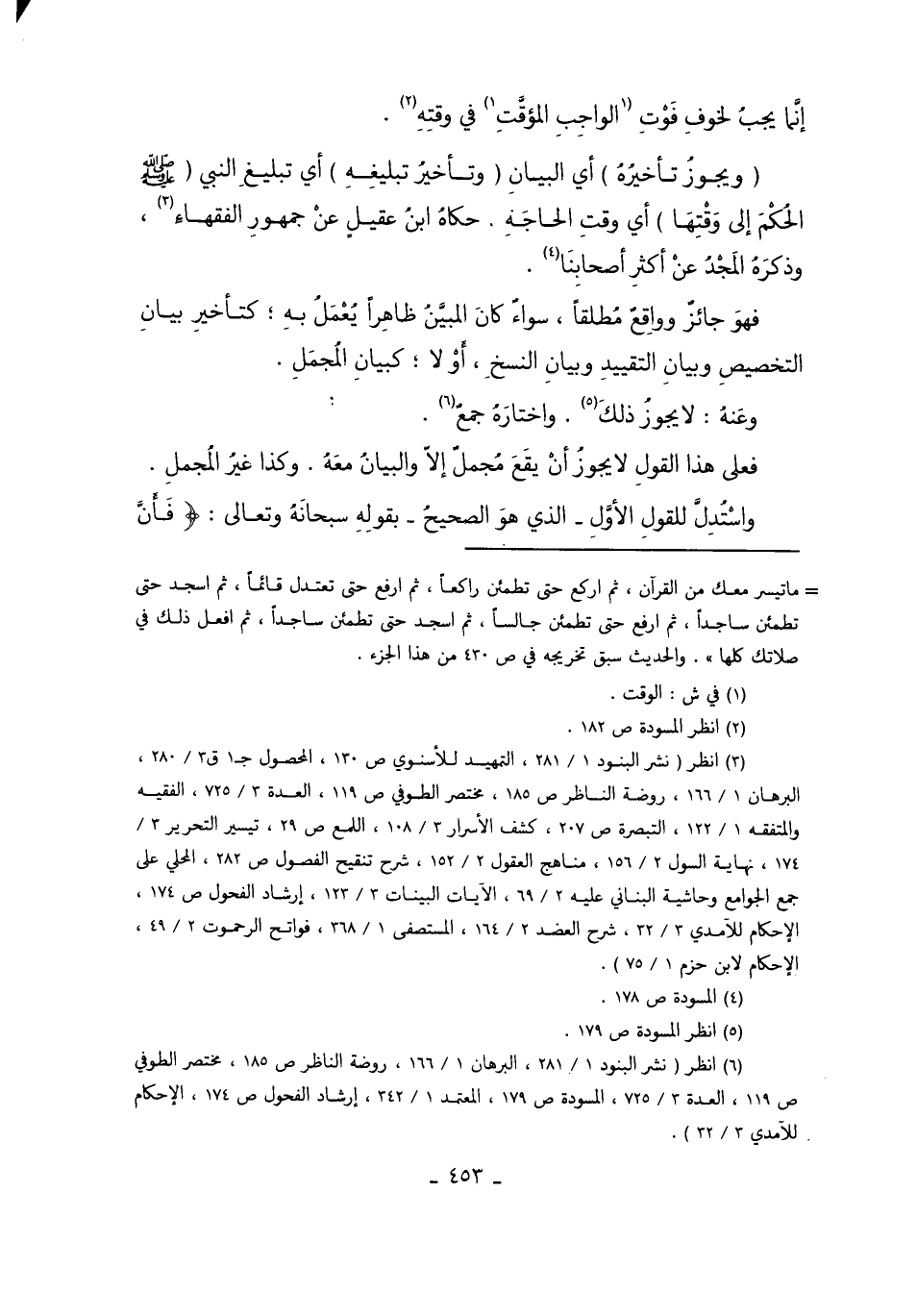 "وَيَجُوزُ تَأْخِيرُهُ" أَيْ الْبَيَانِ "وَتَأْخِيرُ تَبْلِيغِهِ" أَيْ تَبْلِيغِ النَّبِيِّ "صَلَّى اللَّهُ عَلَيْهِ وَسَلَّمَ الْحُكْمَ إلَى وَقْتِهَا" أَيْ وَقْتِ الْحَاجَةِ, حَكَاهُ ابْنُ عَقِيلٍ عَنْ جُمْهُورِ الْفُقَهَاءِ3, وَذَكَرَهُ الْمَجْدُ عَنْ أَكْثَرِ أَصْحَابِنَا4, فَهُوَ جَائِزٌ، وَوَاقِعٌ مُطْلَقًا، سَوَاءٌ كَانَ الْمُبَيَّنُ ظَاهِرًا يُعْمَلُ بِهِ، كَتَأْخِيرِ بَيَانِ التَّخْصِيصِ، وَبَيَانِ التَّقْيِيدِ، وَبَيَانِ النَّسْخِ أَوْ لا، كَبَيَانِ الْمُجْمَلِ.