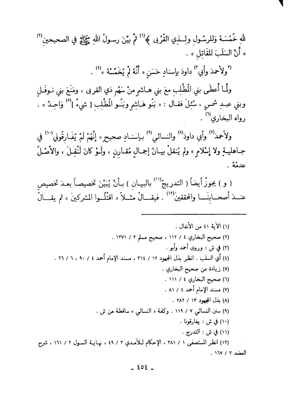 لِلَّهِ خُمُسَهُ وَلِلرَّسُولِ وَلِذِي الْقُرْبَى} 1 ثُمَّ بَيَّنَ رَسُولُ اللَّهِ صَلَّى اللَّهُ عَلَيْهِ وَسَلَّمَ فِي الصَّحِيحَيْنِ2 أَنَّ السَّلَبَ لِلْقَاتِلِ.