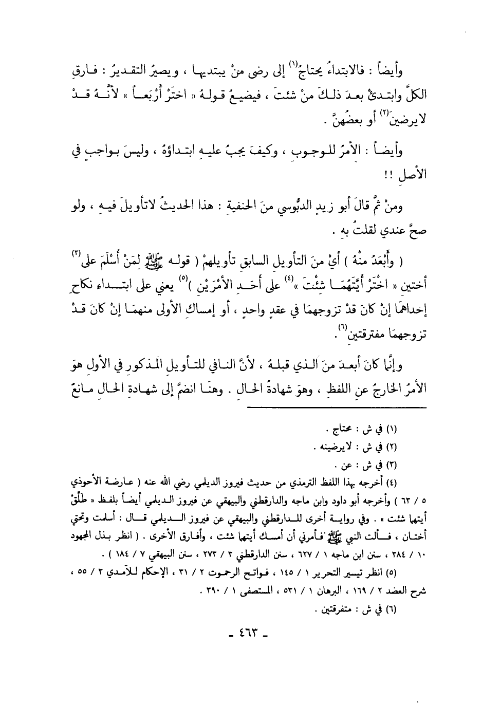 "وَأَبْعَدُ مِنْهُ" أَيْ مِنْ التَّأْوِيلِ السَّابِقِ تَأْوِيلُهُمْ "قَوْلَهُ صَلَّى اللَّهُ عَلَيْهِ وَسَلَّمَ لِمَنْ أَسْلَمَ عَنْ3 أُخْتَيْنِ "اخْتَرْ أَيَّتَهُمَا 4 شِئْت" عَلَى أَحَدِ الأَمْرَيْنِ"5 يَعْنِي عَلَى ابْتِدَاءِ نِكَاحِ إحْدَاهُمَا، إنْ كَانَ قَدْ تَزَوَّجَهُمَا فِي عَقْدٍ وَاحِدٍ، أَوْ إمْسَاكِ الأُولَى مِنْهُمَا، إنْ كَانَ قَدْ تَزَوَّجَهُمَا مُفْتَرِقَتَيْنِ6.