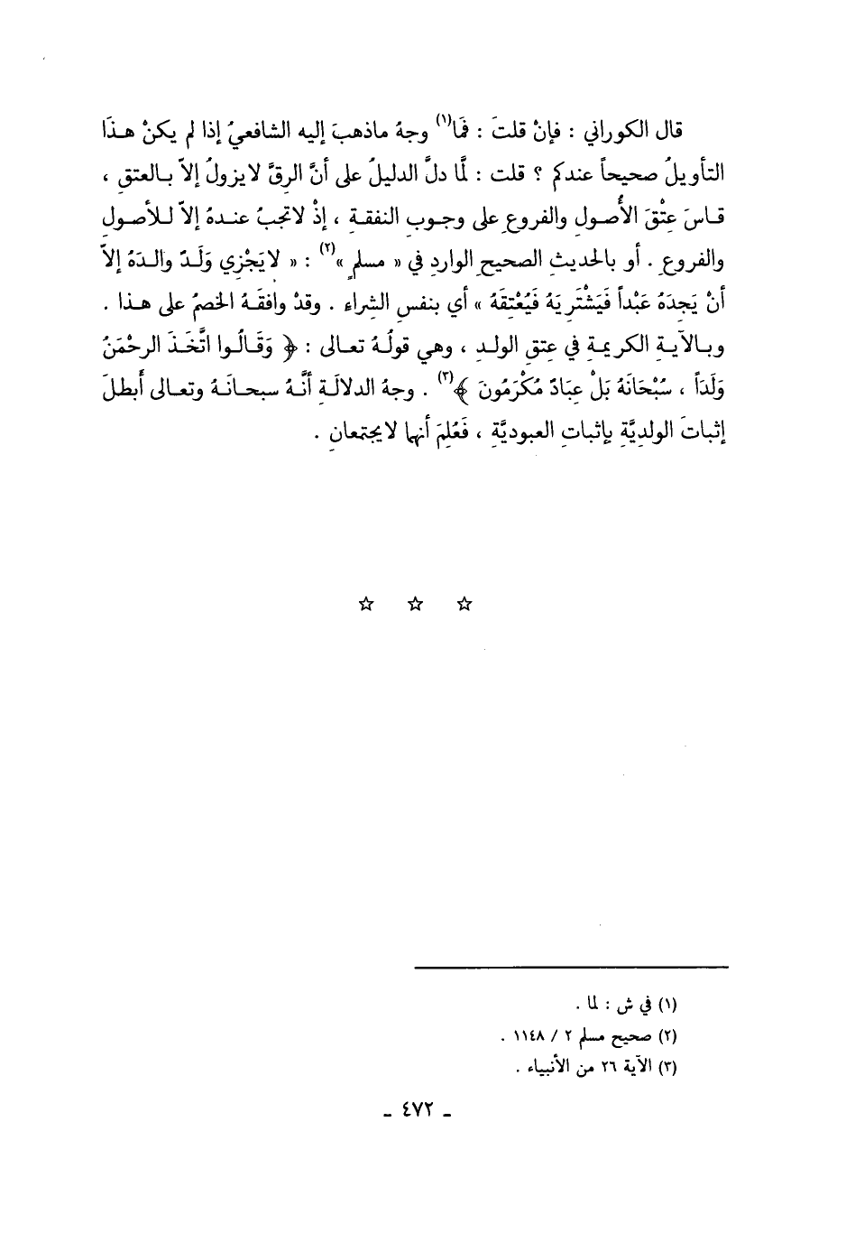 قَالَ الْكُورَانِيُّ: فَإِنْ قُلْت لِمَا1 وَجَّهَ مَا ذَهَبَ إلَيْهِ الشَّافِعِيُّ، إذَا لَمْ يَكُنْ هَذَا التَّأْوِيلُ صَحِيحًا عِنْدَكُمْ؟ قُلْت: لَمَّا دَلَّ الدَّلِيلُ عَلَى أَنَّ الرِّقَّ لا يَزُولُ إلاَّ بِالْعِتْقِ قَاسَ عِتْقَ الأُصُولِ وَالْفُرُوعِ عَلَى وُجُوبِ النَّفَقَةِ، إذْ لا تَجِبُ عِنْدَهُ إلاَّ لِلْأُصُولِ وَالْفُرُوعِ أَوْ بِالْحَدِيثِ الصَّحِيحِ الْوَارِدِ فِي مُسْلِمٍ2 "لا يَجْزِي وَلَدٌ وَالِدَهُ إلاَّ أَنْ يَجِدَهُ عَبْدًا فَيَشْتَرِيَهُ فَيُعْتِقَهُ" أَيْ بِنَفْسِ الشِّرَاءِ وَقَدْ وَافَقَهُ الْخَصْمُ عَلَى هَذَا، وَبِالآيَةِ الْكَرِيمَةِ فِي عِتْقِ الْوَلَدِ وَهِيَ قَوْله تَعَالَى: {وَقَالُوا اتَّخَذَ الرَّحْمَنُ وَلَدًا سُبْحَانَهُ بَلْ عِبَادٌ مُكْرَمُونَ} 3 وَجْهُ الدَّلالَةِ: أَنَّهُ سُبْحَانَهُ وَتَعَالَى أَبْطَلَ إثْبَاتَ الْوَلَدِيَّةِ بِإِثْبَاتِ الْعُبُودِيَّةِ فَعُلِمَ أَنَّهُمَا لا يَجْتَمِعَانِ.