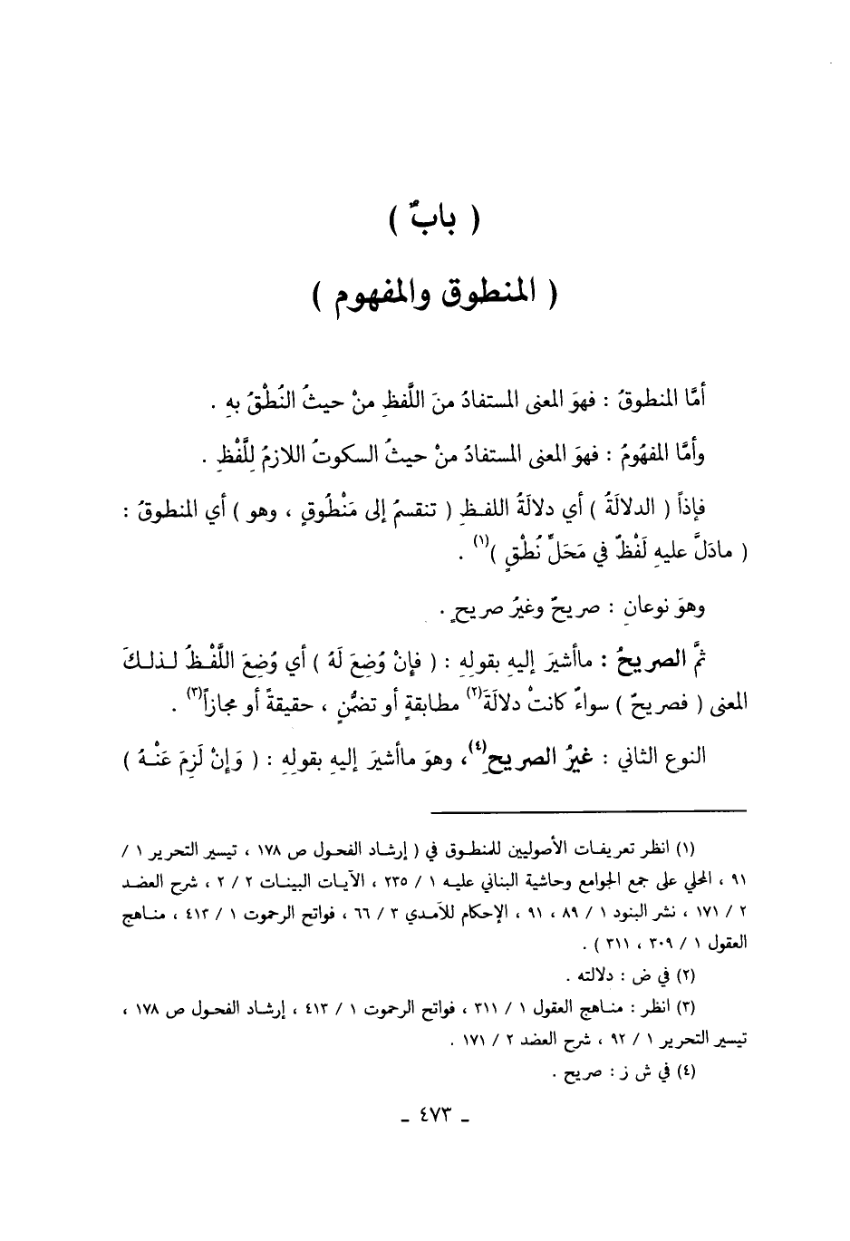 1 انظر تعريفات الأصوليين للمنطوق في "إرشاد الفحول ص178، تيسير التحرير 1/91، المحلي على جمع الجوامع وحاشية البناني عليه 1/235، الآيات البينات 2/2، شرح العضد 2/171، نشر البنود 1/89، 91، الإحكام للآمدي 3/66، فواتح الرحموت 1/413، منهاج العقول 1/309، 311".
