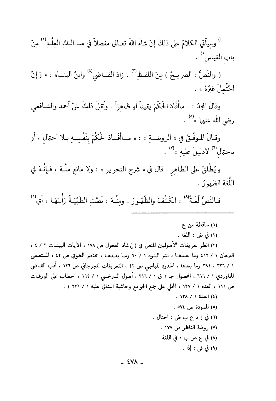 3 انظر تعريفات الأصوليين للنص في "إرشاد الفحول ص178، الآيات البينات 2/4، البرهان 1/412 وما بعدها، نشر البنود 1/90 وما بعدها، مختصر الطوفي ص42، المستصفى 1/336، 384 وما بعدها، الحدود للباجي ص42، التعريفات للجرجاني ص126، أدب القاضي للماوردي 1/616، المحصول ج1ق1/316، أصول السرخسي 1/164، الحطاب على الورقات ص111، العدة 1/137، المحلي على جمع الجوامع وحاشية البناني عليه 1/236".