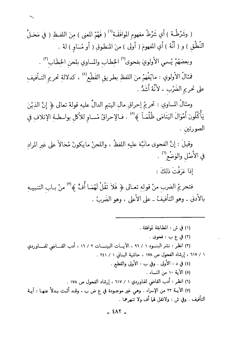 "وَشَرْطُهُ" أَيْ شَرْطُ مَفْهُومِ الْمُوَافَقَةِ1 "فَهْمُ الْمَعْنَى" مِنْ اللَّفْظِ "فِي مَحَلِّ النُّطْقِ" وَ "أَنَّهُ" أَيْ الْمَفْهُومُ "أَوْلَى" مِنْ الْمَنْطُوقِ "أَوْ مُسَاوٍ" لَهُ.