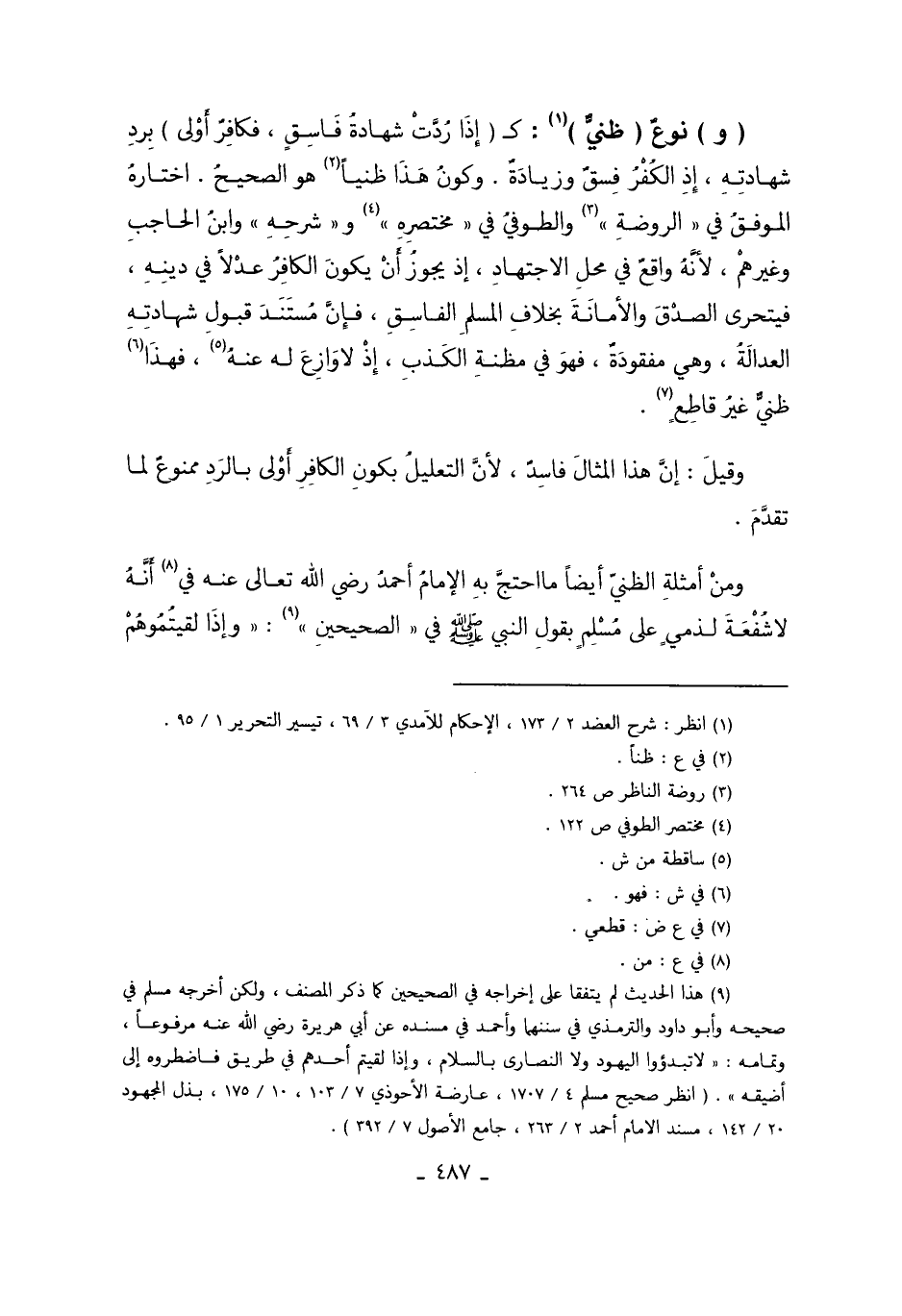 وَمِنْ أَمْثِلَةِ الظَّنِّيِّ أَيْضًا: مَا احْتَجَّ بِهِ الإِمَامُ أَحْمَدُ رَضِيَ اللَّهُ تَعَالَى عَنْهُ فِي8 أَنَّهُ لا شُفْعَةَ لِذِمِّيٍّ عَلَى مُسْلِمٍ بِقَوْلِ النَّبِيِّ صَلَّى اللَّهُ عَلَيْهِ وَسَلَّمَ فِي الصَّحِيحَيْنِ9 {وَإِذَا لَقِيتُمُوهُمْ