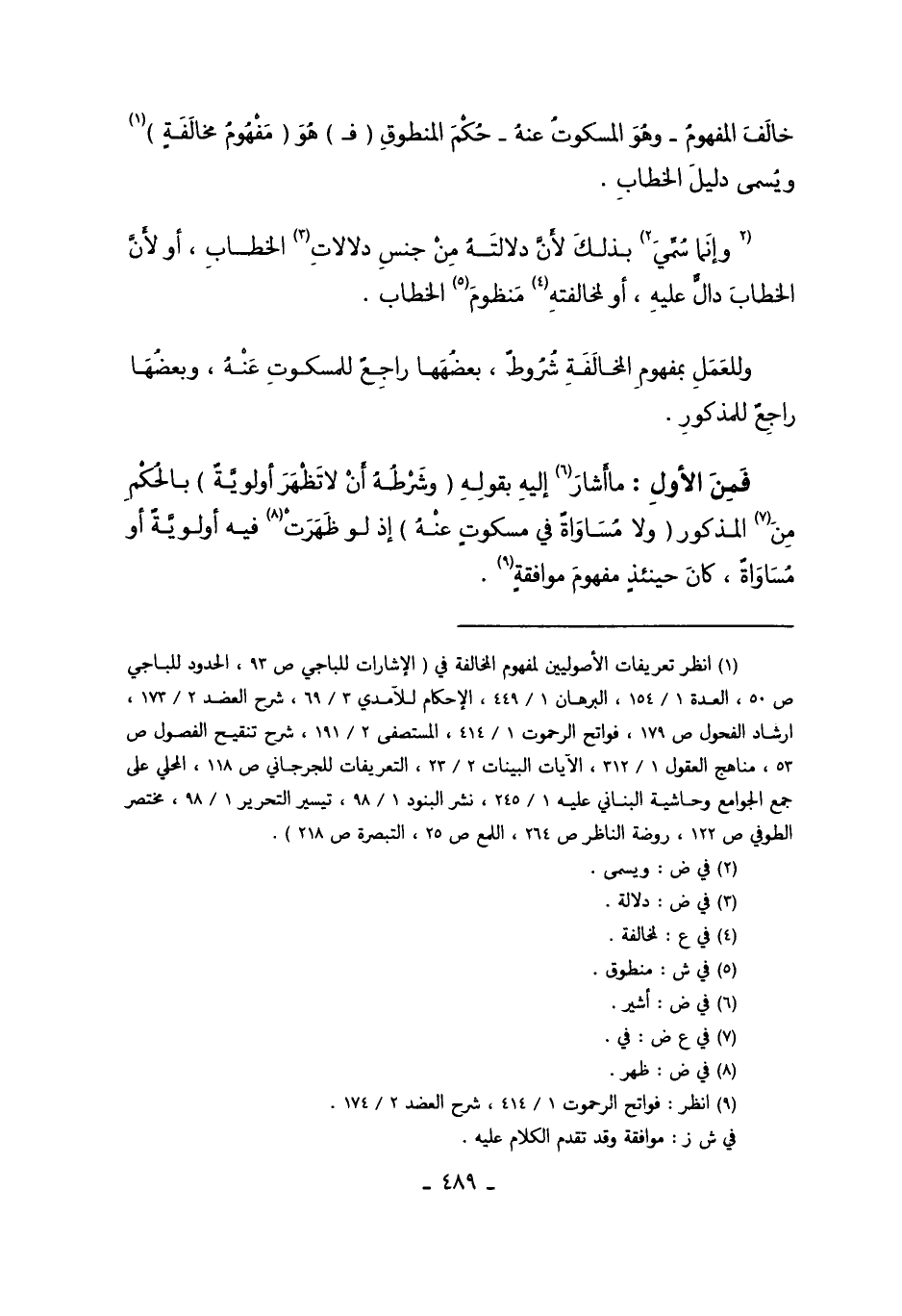 1 انظر تعريفات الأصوليين لمفهوم المخالفة في "الإشارات للباجي ص93، الحدود للباجي ص50، العدة 1/154، البرهان 1/449، الإحكام للآمدي 3/69، شرح العضد 2/173، إرشاد الفحول ص179، فواتح الرحموت 1/414، المستصفى 2/191، شرح تنقيح الفصول ص53، منهاج العقول 1/312، الآيات البينات 2/23، التعريفات للجرجاني ص118، المحلي على جمع الجوامع وحاشية البناني عليه 1/245، نشر البنود 1/98، تيسير التحرير 1/98، مختصر الطوفي ص122، روضة الناظر ص264، اللمع ص25، التبصرة 218".