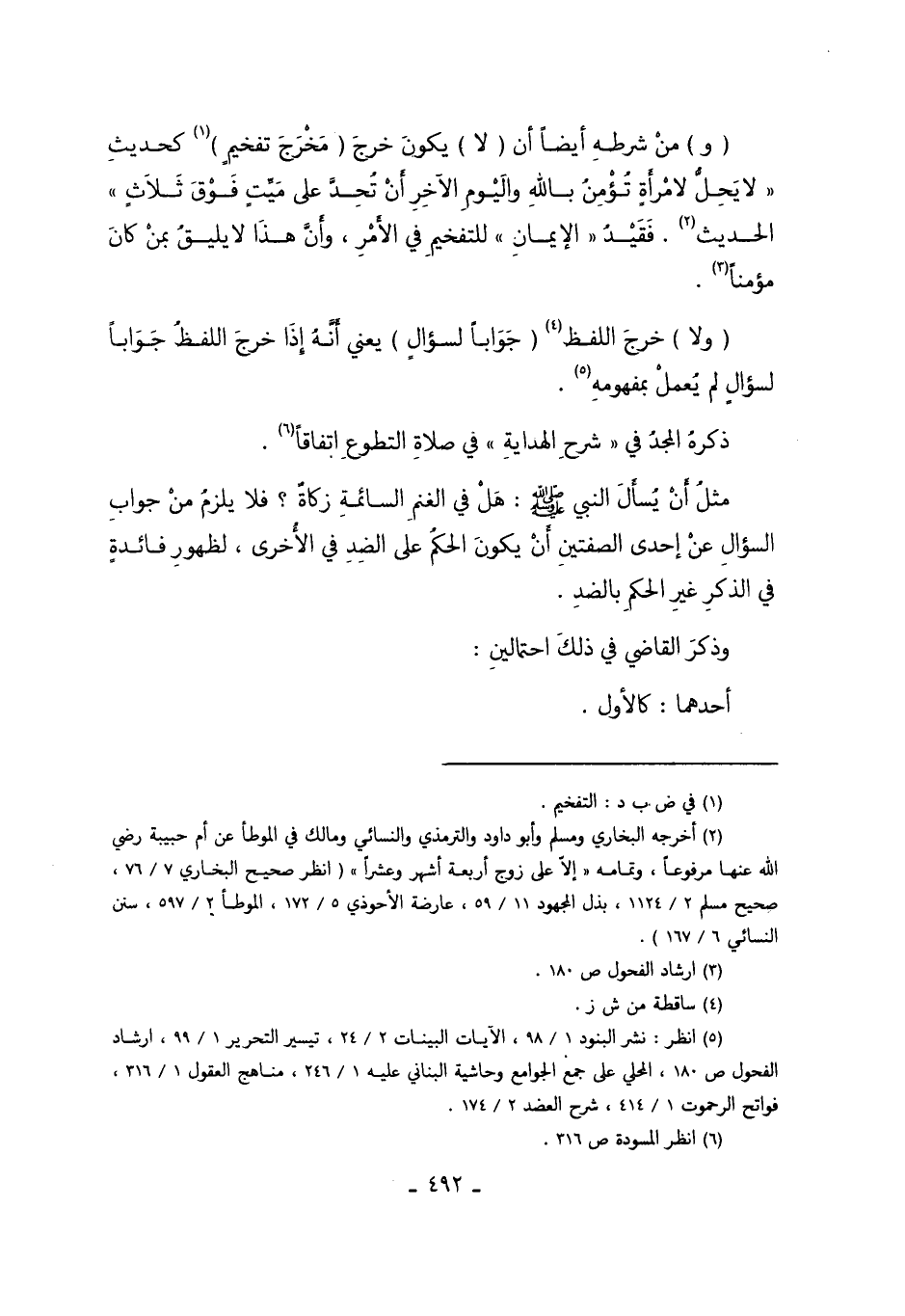 "وَ" مِنْ شَرْطِهِ أَيْضًا: أَنْ "لا" يَكُونَ خَرَجَ "مَخْرَجَ تَفْخِيمٍ"1 كَحَدِيثِ: "لا يَحِلُّ لامْرَأَةٍ تُؤْمِنُ بِاَللَّهِ وَالْيَوْمِ الآخِرِ أَنْ تُحِدَّ عَلَى مَيِّتٍ فَوْقَ ثَلاثٍ" الْحَدِيثَ2 فَقَيَّدَ "الإِيمَانَ" لِلتَّفْخِيمِ فِي الأَمْرِ، وَأَنَّ هَذَا لا يَلِيقُ بِمَنْ كَانَ مُؤْمِنًا3.