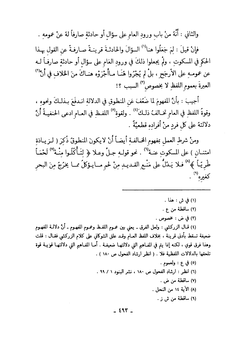 4 قال الزركشي: ولعل الفرق –يعني عموم اللفظ وعموم الفهم- أن دلالة المفهوم ضعيفة تسقط بأدنى قرينة، بخلاف اللفظ العام وقد علق الشوكاني على كلام الزركشي فقال: قلت وهذا فرق قوي، لكنه إنما يتم في المفاهيم التي دلالتها ضعيفة، أما المفاهيم اتلي دلالتها قوية قوة تلحقها بالدلالات اللفظية فلا. "انظر إرشاد الفحول ص180".