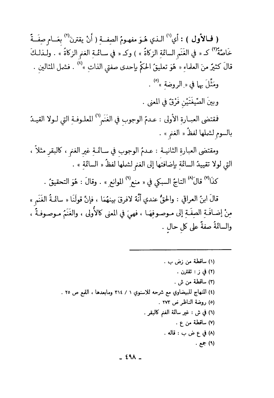 فمُقْتَضَى الْعِبَارَةِ الأُولَى: عَدَمُ الْوُجُوبِ فِي الْغَنَمِ6، الْمَعْلُوفَةِ الَّتِي لَوْلا الْقَيْدُ بِالسَّوْمِ لَشَمَلَهَا لَفْظُ "الْغَنَمِ".