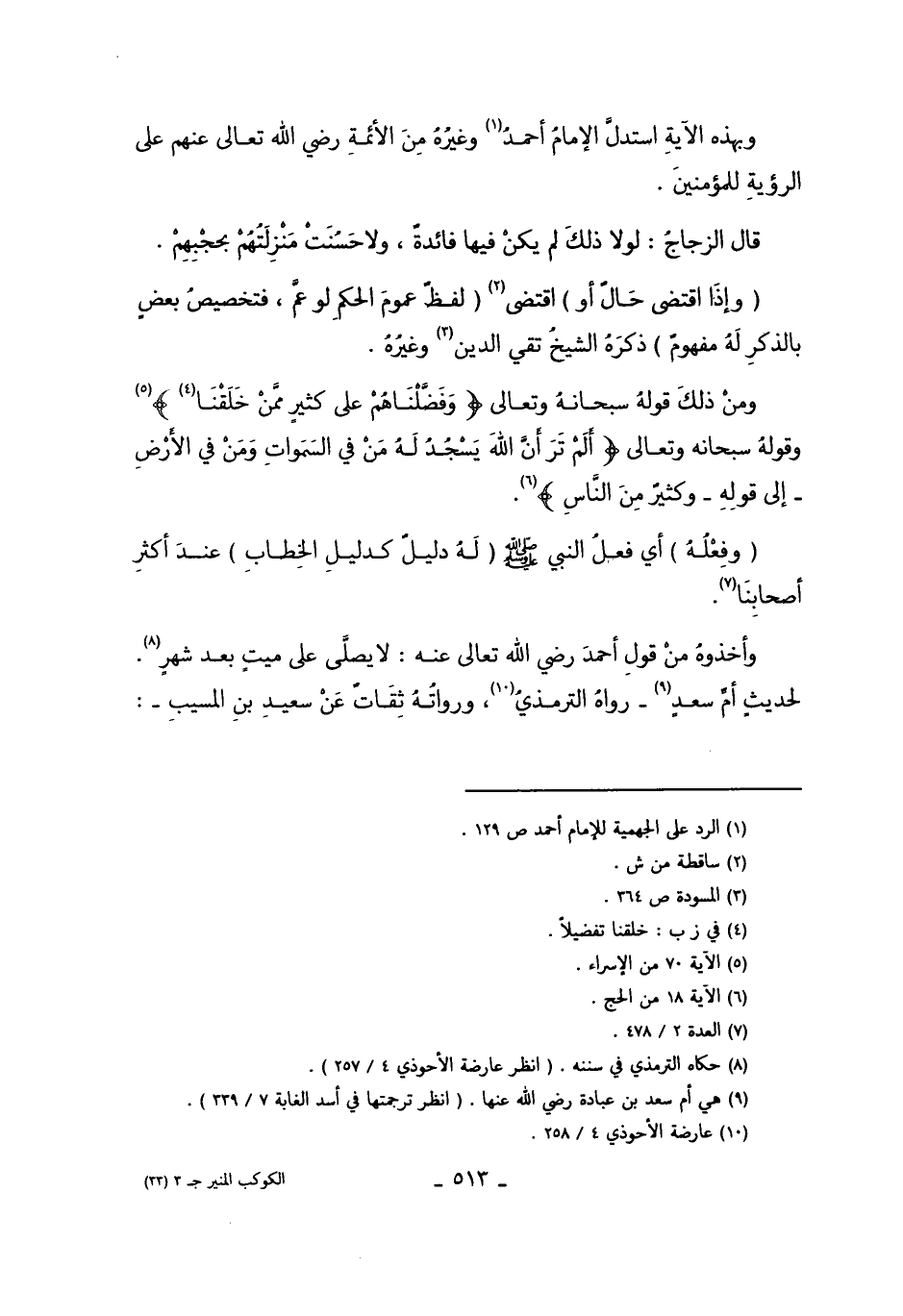 وَمِنْ ذَلِكَ قَوْله تَعَالَى: {وَفَضَّلْنَاهُمْ عَلَى كَثِيرٍ مِمَّنْ خَلَقْنَا4} 5 وقَوْله تَعَالَى: {أَلَمْ تَرَ أَنَّ اللَّهَ يَسْجُدُ لَهُ مَنْ فِي السَّمَوَاتِ وَمَنْ فِي الأَرْضِ} إلَى قَوْلِهِ {وَكَثِيرٌ مِنْ النَّاسِ} 6.