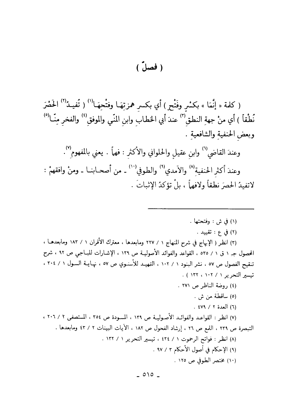 "بِكَسْرٍ وَفَتْحٍ" أَيْ بِكَسْرِ هَمْزَتِهَا وَفَتْحِهَا1 "تُفِيدُ2 الْحَصْرَ" "نُطْقًا" أَيْ مِنْ جِهَةِ النُّطْقِ3 عِنْدَ أَبِي الْخَطَّابِ وَابْنِ الْمُنَى وَالْمُوَفَّقِ4 وَالْفَخْرِ مِنَّا5 وَبَعْضِ الْحَنَفِيَّةِ وَالشَّافِعِيَّةِ.