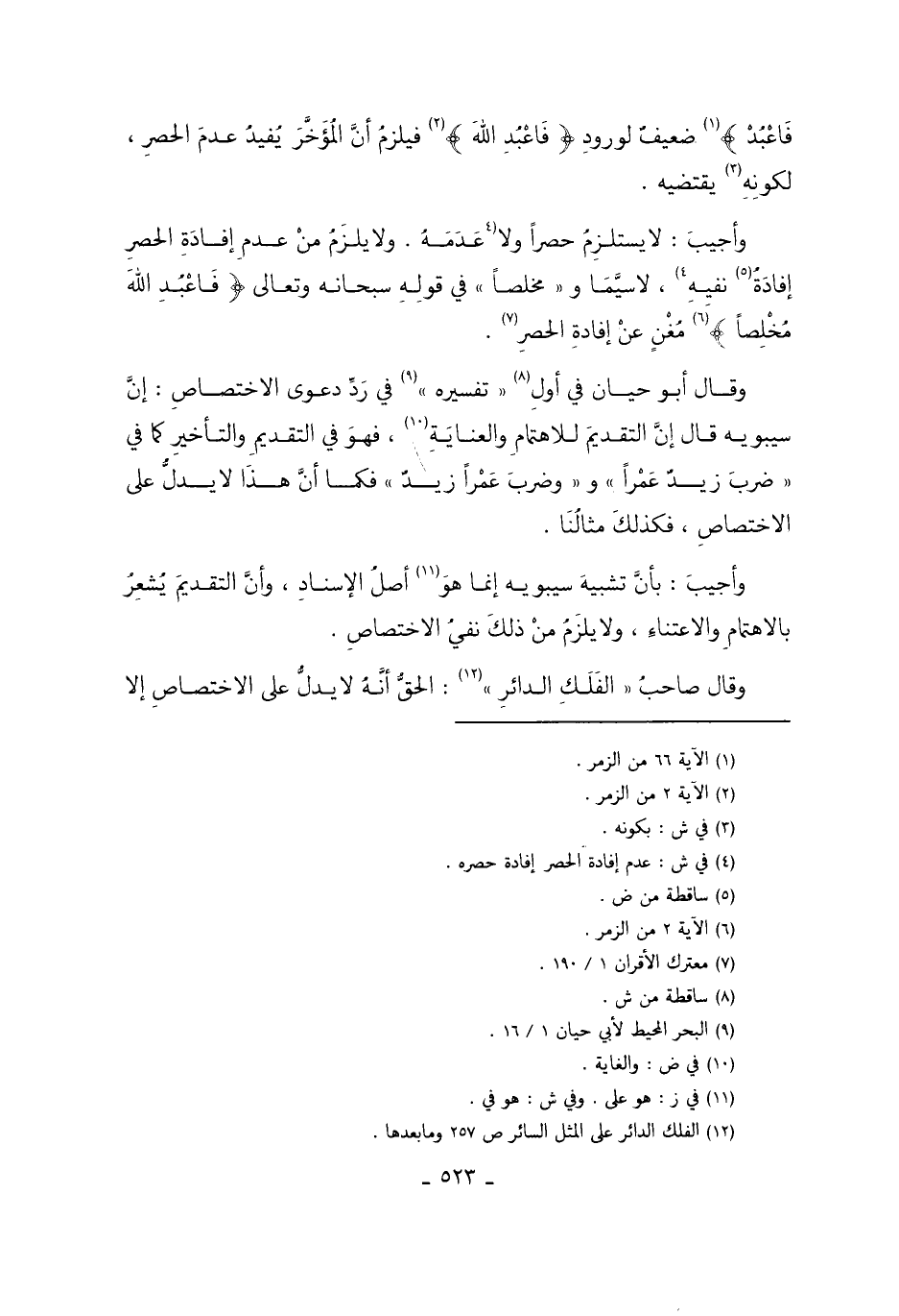 وَقَالَ أَبُو حَيَّانَ فِي أَوَّلِ8 تَفْسِيرِهِ9 فِي رَدِّ دَعْوَى الاخْتِصَاصِ: إنَّ سِيبَوَيْهِ قَالَ: إنَّ التَّقْدِيمَ لِلاهْتِمَامِ وَالْعِنَايَةِ10، فَهُوَ فِي التَّقْدِيمِ وَالتَّأْخِيرِ كَمَا فِي ضَرَبَ زَيْدٌ عَمْرًا وَضَرَبَ عَمْرًا زَيْدٌ، فَكَمَا أَنَّ هَذَا لا يَدُلُّ عَلَى الاخْتِصَاصِ، فَكَذَلِكَ مِثَالُنَا.