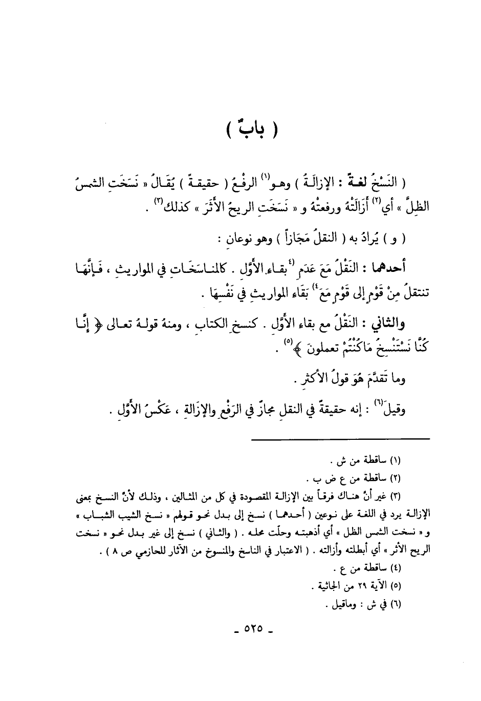 3 غير أن هناك فرقاً بين الإزالة المقصود في كل من المثالين، وذلك لأن النسخ بمعنى الإزالة يرد في اللغة على نوعين "أحدهما" نسخ إلى بدل نحو قولهم "نسخ الشيب الشباب" و "نسخت الشمس الظل" أي أذهبته وحلت محله.