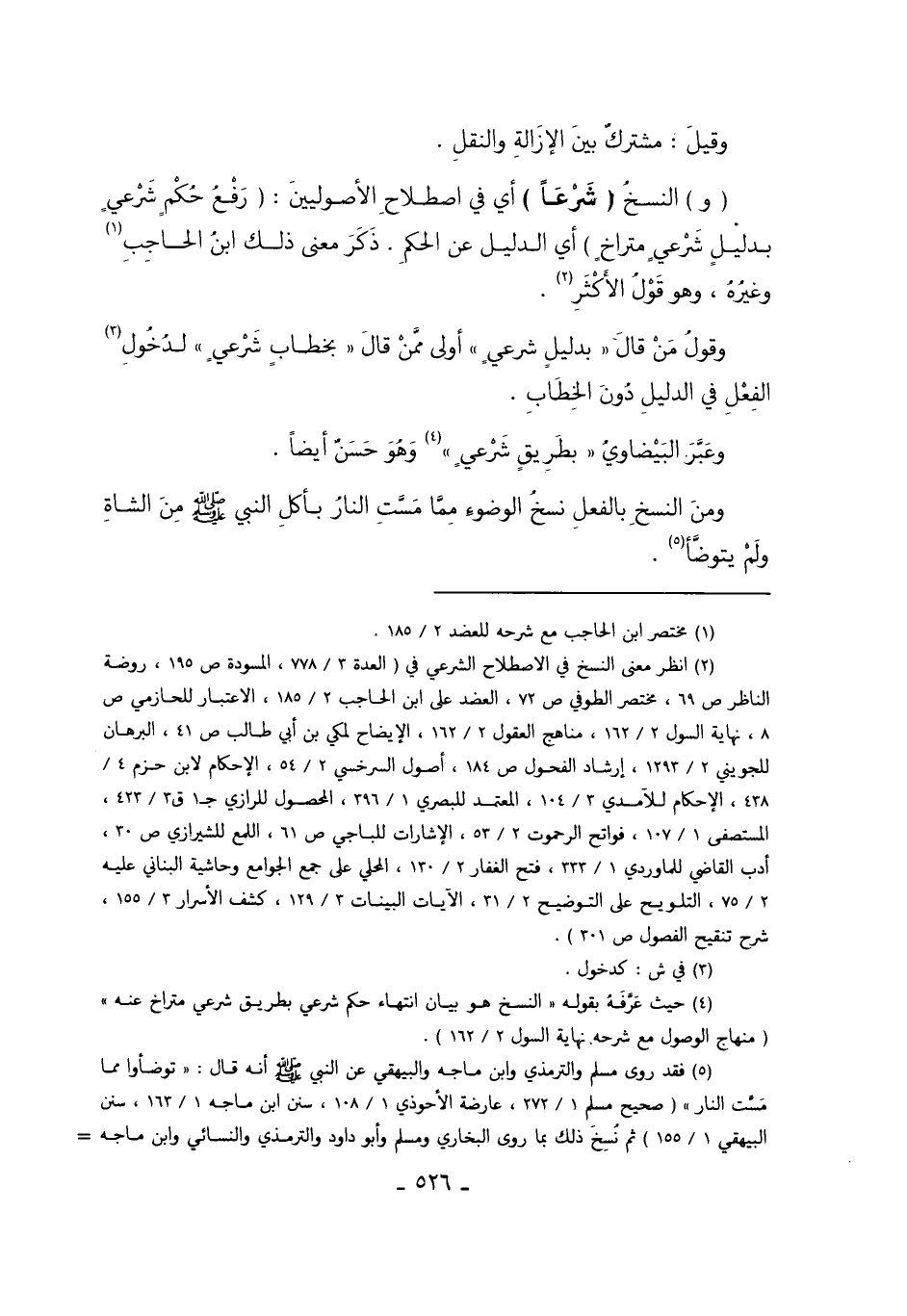 2 انظر معنى النسخ في الاصطلاح الشرعي في "العدة 3/778، المسودة ص195، روضة الناظر ص69، مختصر الطوفي ص72، العضد على ابن الحاجب 2/185، الاعتبار للحازمي ص8، نهاية السول 2/162، منهاج العقول 2/162، الإيضاح لمكي بن أبي طالب ص41، البرهان للجويني 2/1293، إرشاد الفحول ص184، أصول السرخسي 2/54، الإحكام لابن حزم 4/438، الإحكام للآمدي 3/104، المعتمد للبصري 1/396، المحصول للرازي ج1 ق3/423، المستصفى 1/107، فواتح الرحموت 2/53، الإشارات للباجي ص61، اللمع للشيرازي ص30، أدب القاضي للماوردي 1/333، فتح الغفار 2/130، المحلي على جمع الجوامع وحاشية البناني عليه 2/75، التلويح على التوضيح 2/31، الآيات البينات 3/129، كشف الأسرار 3/155، شرح تنقيح الفصول ص301".