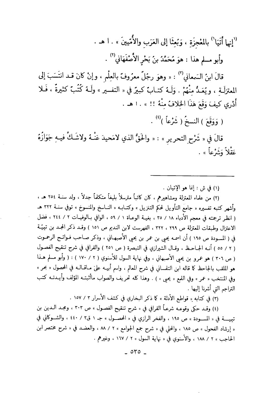 2 من علماء المعتزلة ومشاهيرهم، كان كاتباً مترسلاً بليغاً متكلماً جدلاً، ولد سنة 254 هـ، وأشهر كتبه تفسيره "جامع التأويل لمحكم التنزيل" وكتابه "الناسخ والمنسوخ" توفي سنة 322هـ "انظر ترجمته في معجم الأدباء 18/35، بغية الوعاة 1/59، الوافي بالوفيات 2/244، فضل الاعتزال وطبقات المعتزلة ص299، 322، الفهرست لابن النديم ص151" وقد ذكر المجد بن تيمية في "المسودة ص195" أن اسمه يحيى بن عمر بن يحيى الأصبهاني، وذكر صاحب فواتح الرحموت"2/55" أنه الجاحظ، وقال الشيرازي في التبصرة "ص251" والقرافي في شرح تنقيح الفصول "ص206" هو عمرو بن يحيى الأصبهاني، وفي نهاية السول"2/170": "وأبو مسلم هو الملقب بالجاحظ كما قاله ابن التلمساني في شرح المعالم، واسم أبيه على ما قاله في المحصول "بحر" وفي المنتخب "عمر" وفي اللمع "يحيى". وهذا كله تحريف والصواب ما أثبته المؤلف وأيدته كتب التراجم التي أشرنا إليها.
