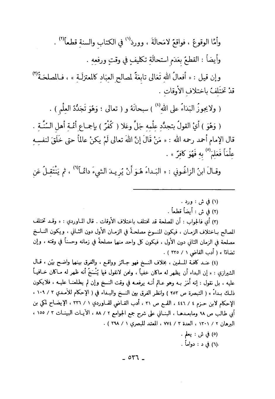 4 عند كافة المسلمين، بخلاف النسخ فهو جائز وواقع، والفرق بينهما واضح بين، قال الشيرازي: "إن البداء أن يظهر له ما كان خفياً، ونحن لا نقول فيما ينسخ أنه ظهر له ما كان خافياً عليه، بل نقول: إنه أمر به وهو عالم أنه يرفعه في وقت النسخ وإن لم يطلعنا عليه، فلا يكون ذلك بداءً" "التبصرة ص253" وانظر الفرق بين النسخ والبداء في "الإحكام للآمدي 3/109، الإحكام لابن جزم 4/446، اللمع ص31، أدب القاضي للماوردي 1/336، الإيضاح لمكي بن أبي طالب ص98 وما بعدها، البناني على شرح جمع الجوامع 2/88، الآيات البينات 3/155، البرهان 2/1301، العدة 3/774، المعتمد للبصري 1/398".