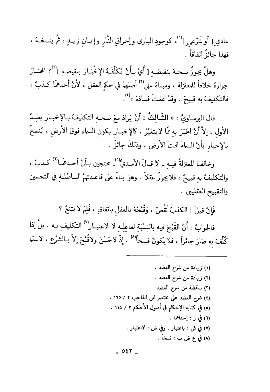 قَالَ الْبِرْمَاوِيُّ: الثَّالِثُ: أَنْ يُرَادَ مَعَ نَسْخِهِ التَّكْلِيفُ بِالإِخْبَارِ بِضِدِّ الأَوَّلِ، إلاَّ أَنَّ الْمُخْبَرَ بِهِ مِمَّا لا يَتَغَيَّرُ كَالإِخْبَارِ بِكَوْنِ السَّمَاءِ فَوْقَ الأَرْضِ، يُنْسَخُ بِالإِخْبَارِ بِأَنَّ السَّمَاءَ تَحْتَ الأَرْضِ. وَذَلِكَ جَائِزٌ وَخَالَفَ الْمُعْتَزِلَةُ فِيهِ، كَمَا قَالَ الآمِدِيُّ5، مُحْتَجِّينَ بِأَنَّ أَحَدَهُمَا6 كَذِبٌ، وَالتَّكْلِيفُ بِهِ قَبِيحٌ، فَلا يَجُوزُ عَقْلاً. وَهُوَ بِنَاءٌ عَلَى قَاعِدَتِهِمْ الْبَاطِلَةِ فِي التَّحْسِينِ وَالتَّقْبِيحِ الْعَقْلِيَّيْنِ.