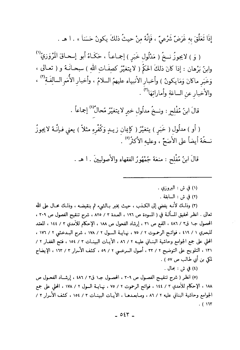 "وَ" لا يَجُوزُ نَسْخُ "مَدْلُولِ خَبَرٍ" إجْمَاعًا حَكَاهُ أَبُو إِسْحَاقَ الْمَرْوَزِيُّ1. وَابْنُ بُرْهَانٍ إذَا كَانَ ذَلِكَ الْحُكْمُ "لا يَتَغَيَّرُ كَصِفَاتِ اللَّهِ" سُبْحَانَهُ وَ "تَعَالَى، وَخَبَرِ مَا كَانَ وَمَا يَكُونُ" وَأَخْبَارِ الأَنْبِيَاءِ عَلَيْهِمْ السَّلامُ، وَأَخْبَارِ الأُمَمِ السَّالفةِ2 وَالإِخْبَارِ عَنْ السَّاعَةِ وَأَمَارَاتِهَا3.