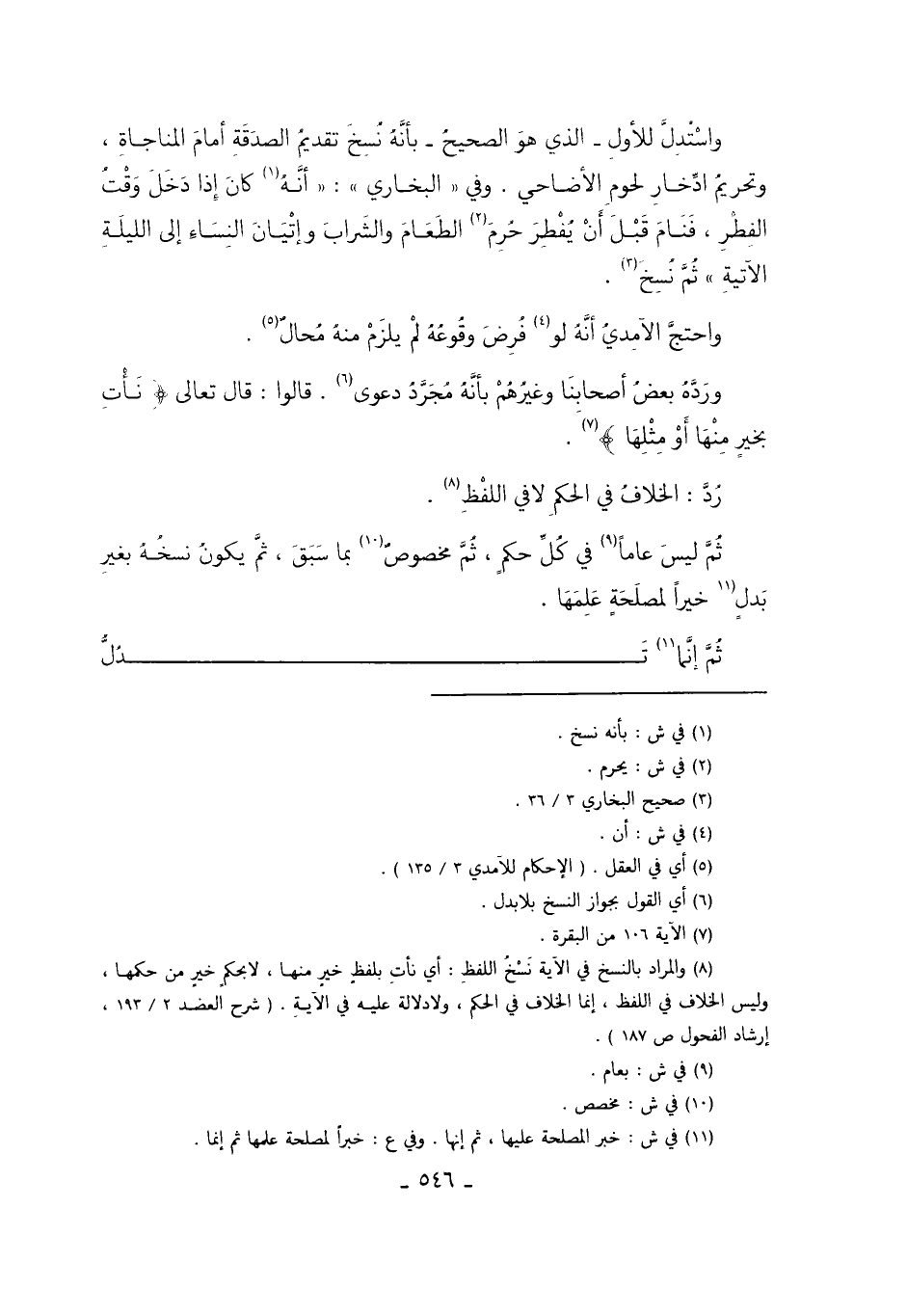 وَاسْتُدِلَّ لِلأَوَّلِ -الَّذِي هُوَ الصَّحِيحُ- بِأَنَّهُ نَسْخُ تَقْدِيمِ الصَّدَقَةِ أَمَامَ الْمُنَاجَاةِ، وَتَحْرِيمِ ادِّخَارِ لُحُومِ الأَضَاحِيِّ وَفِي الْبُخَارِيِّ أَنَّهُ1 كَانَ إذَا دَخَلَ وَقْتُ الْفِطْرِ، فَنَامَ قَبْلَ أَنْ يُفْطِرْ حَرِّمُ2 الطَّعَامَ وَالشَّرَابَ، وَإِتْيَانَ النِّسَاءِ إلَى اللَّيْلَةِ الآتِيَةِ ثُمَّ نُسِخَ3.