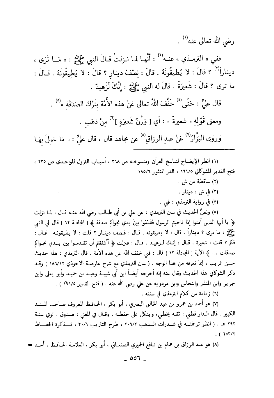5 ونص الحديث في سنن الترمذي: عن علي بن أبي طالب رضي الله عنه قال: لما نزلت {يَا أَيُّهَا الَّذِينَ آمَنُوا إِذَا نَاجَيْتُمُ الرَّسُولَ فَقَدِّمُوا بَيْنَ يَدَيْ نَجْوَاكُمْ صَدَقَةً} المجادلة/12 قال لي النبي صلى الله عليه وسلم: "ما ترى؟ ديناراً". قال: لا يطيقونه. قال: "فنصف دينار"؟ قلت: لا يطيقونه. قال: "فكم"؟ قلت: شعيرة. قال: "إنك لزهيد". قال: فنزلت {أَأَشْفَقْتُمْ أَن تُقَدِّمُوا بَيْنَ يَدَيْ نَجْوَاكُمْ صَدَقَاتٍ} الآية "المجادلة/13" قال: فبي خفف الله عن هذه الأمة. قال الترمذي: هذا حديث حسن غريب إنما نعرفه من هذا الوجه. "سنن الترمذي مع شرح عارضة الأحوذي 12/186" وقد ذكر الشوكاني هذا الحديث وقال عنه إنه أخرجه أيضاً ابن أبي شيبة وعبد بن حميد وأبو يعلى وابن جرير وابن المنذر والنحاس وابن مردويه عن علي رضي الله عنه. "فتح القدير 5/191".