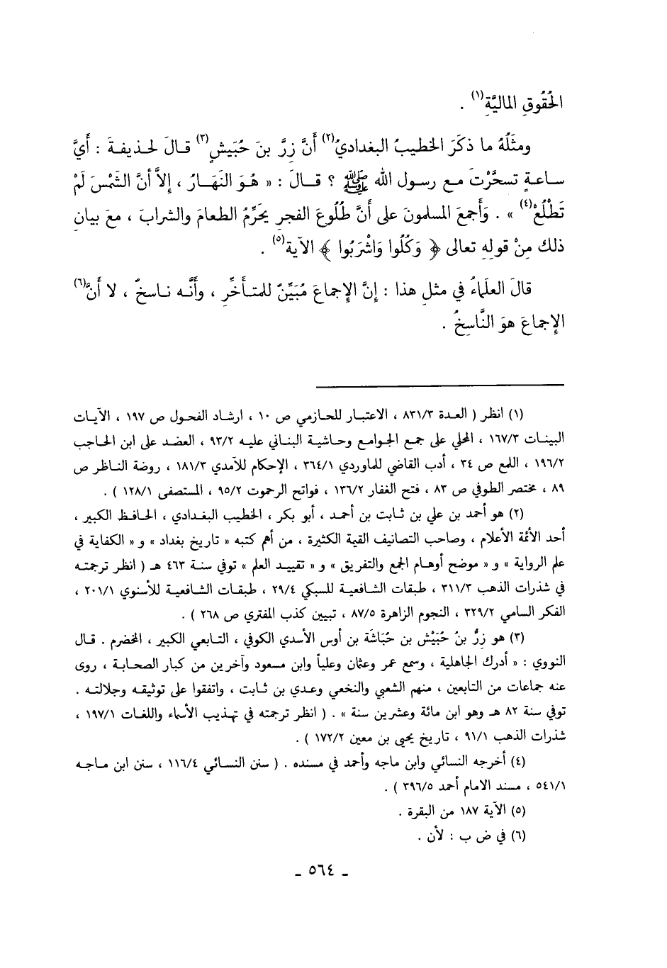 3 هو زر بن حبيش بن حباشة بن أوس الأسدي الكوفي، التابعي الكبير، المخضرم، قال النووي: "أدرك الجاهلية، وسمع عمر وعثمان وعلياً وابن مسعود وآخرين من كبار الصحابة، وروى عنه جماعات التابعين، منهم الشعبي والنخعي وعدي بن ثابت، واتفقوا على توثيقه وجلالته، توفي سنة8 هـ، وهو ابن مائة وعشرين سنة". "انظر ترجمته في تهذيب الأسماء واللغات 1/197، شذرات الذهب 1/91، تاريخ يحيى بن معين 2/172".