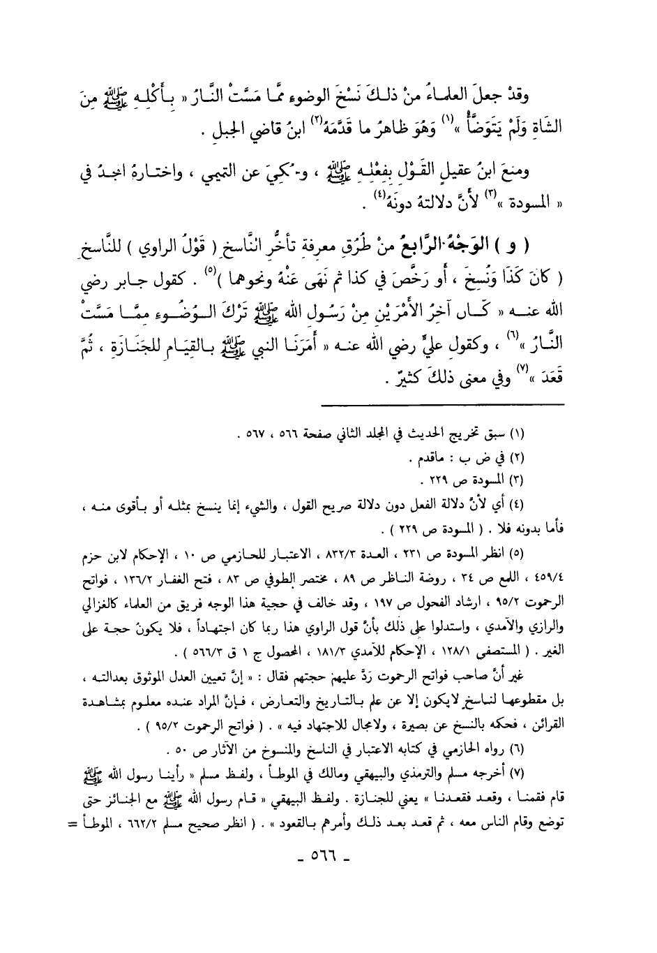 "وَ" الْوَجْهُ الرَّابِعُ: مِنْ طُرُقِ مَعْرِفَةِ تَأَخُّرِ النَّاسِخِ "قَوْلُ الرَّاوِي" لِلنَّاسِخِ "كَانَ كَذَا وَنُسِخَ، أَوْ رُخِّصَ فِي كَذَا ثُمَّ نُهِيَ عَنْهُ وَنَحْوِهِمَا"5 كَقَوْلِ جَابِرٍ رَضِيَ اللَّهُ عَنْهُ كَانَ آخِرُ الأَمْرَيْنِ مِنْ رَسُولِ اللَّهِ صَلَّى اللَّهُ عَلَيْهِ وَسَلَّمَ تَرْكَ الْوُضُوءِ مِمَّا مَسَّتْ النَّارُ6 وَكَقَوْلِ عَلِيٍّ رَضِيَ اللَّهُ عَنْهُ أَمَرَنَا النَّبِيُّ صَلَّى اللَّهُ عَلَيْهِ وَسَلَّمَ بِالْقِيَامِ لِلْجِنَازَةِ، ثُمَّ قَعَدَ7 وَفِي مَعْنَى ذَلِكَ كَثِيرٌ.