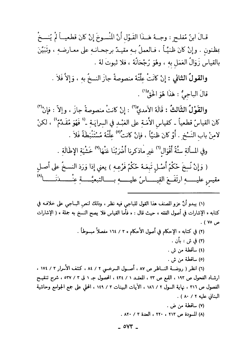 1 يبدو أن عزو المصنف هذا القول للباجي فيه نظر، وذلك لنص الباجي على خلافه في كتابه "الإشارات في أصول الفقه" حيث قال: "فأما القياس فلا يصح النسخ به جملة" "الإشارات ص75".