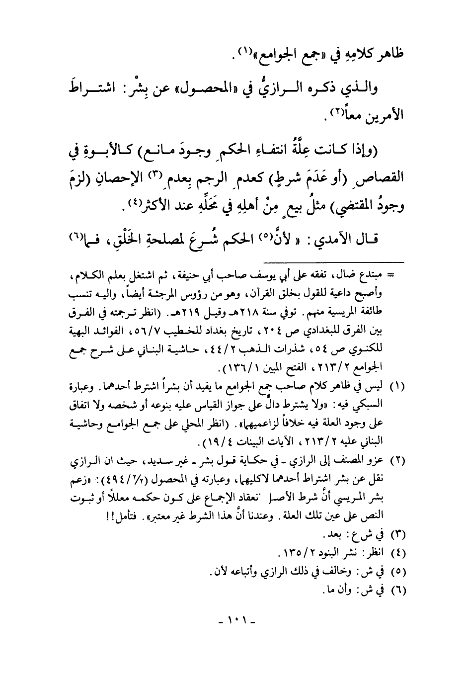 2 عزو المصنف إلى الرازي –في حكاية قول بشر- غير سديد، حيث إن الرازي نقل عن بشر اشتراط أحدهما لا كليهما، وعبارته في المحصول 2/2/494: "زعم بشر المريسي أن شرط الأصل انعقاد الإجماع على كون حكمه معللاً أو ثبوت النص على عين تلك العلة. وعندنا أن هذا الشرط غير معتبر". فتأمل!!