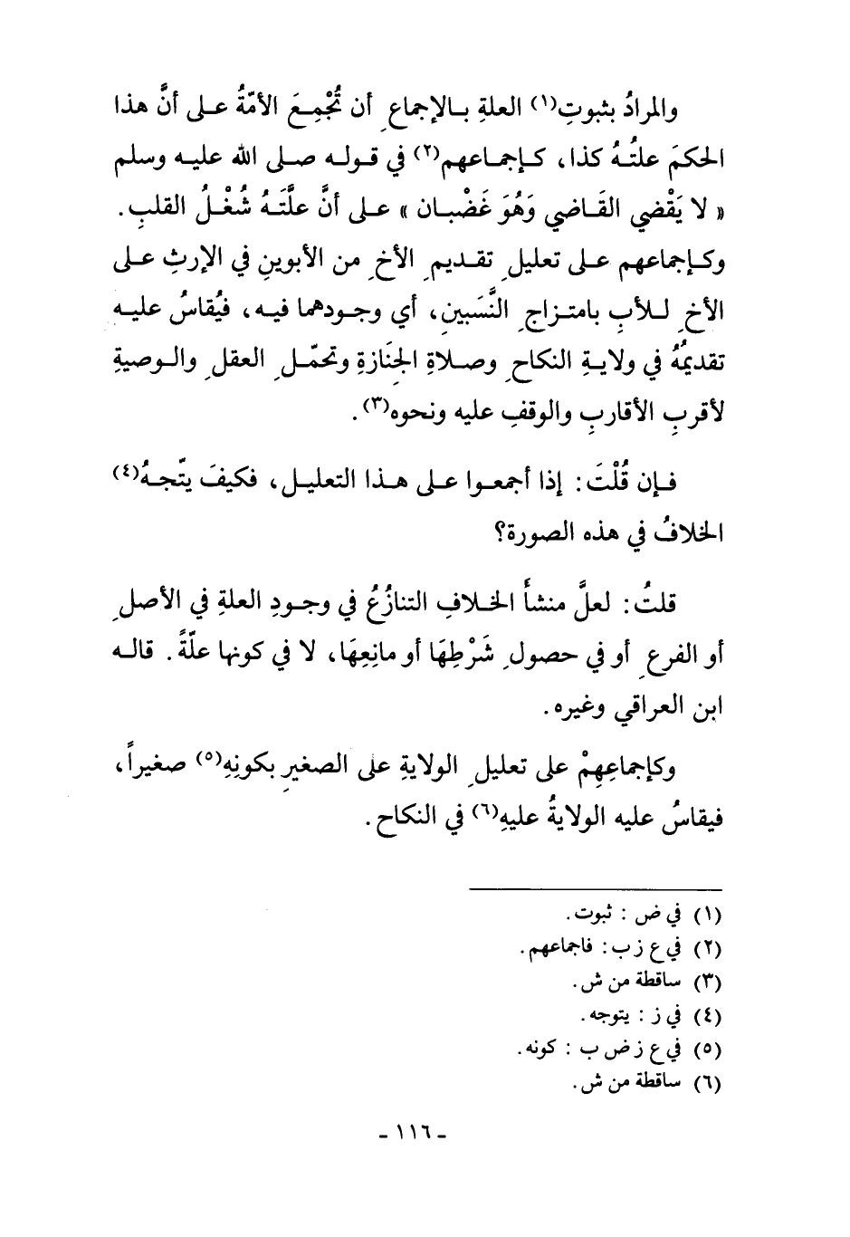 وَالْمُرَادُ بِثُبُوتِ1 الْعِلَّةِ بِالإِجْمَاعِ: أَنْ تُجْمِعَ الأُمَّةُ عَلَى أَنَّ هَذَا الْحُكْمَ عِلَّتُهُ كَذَا. كَإِجْمَاعِهِمْ2 فِي قَوْلِهِ صَلَّى اللَّهُ عَلَيْهِ وَسَلَّمَ "لا يَقْضِي الْقَاضِي وَهُوَ غَضْبَانُ" عَلَى أَنَّ عِلَّتَهُ شَغْلُ الْقَلْبِ، وَكَإِجْمَاعِهِمْ عَلَى تَعْلِيلِ تَقْدِيمِ الأَخِ مِنْ الأَبَوَيْنِ فِي الإِرْثِ عَلَى الأَخِ لِلأَبِ بِامْتِزَاجِ النَّسَبَيْنِ، أَيْ وُجُودِهِمَا فِيهِ، فَيُقَاسُ عَلَيْهِ تَقْدِيمُهُ فِي وِلايَةِ النِّكَاحِ، وَصَلاةِ الْجِنَازَةِ، وَتَحَمُّلِ الْعَقْلِ، وَالْوَصِيَّةِ لأَقْرَبِ الأَقَارِبِ وَالْوَقْفِ عَلَيْهِ وَنَحْوِهِ3.