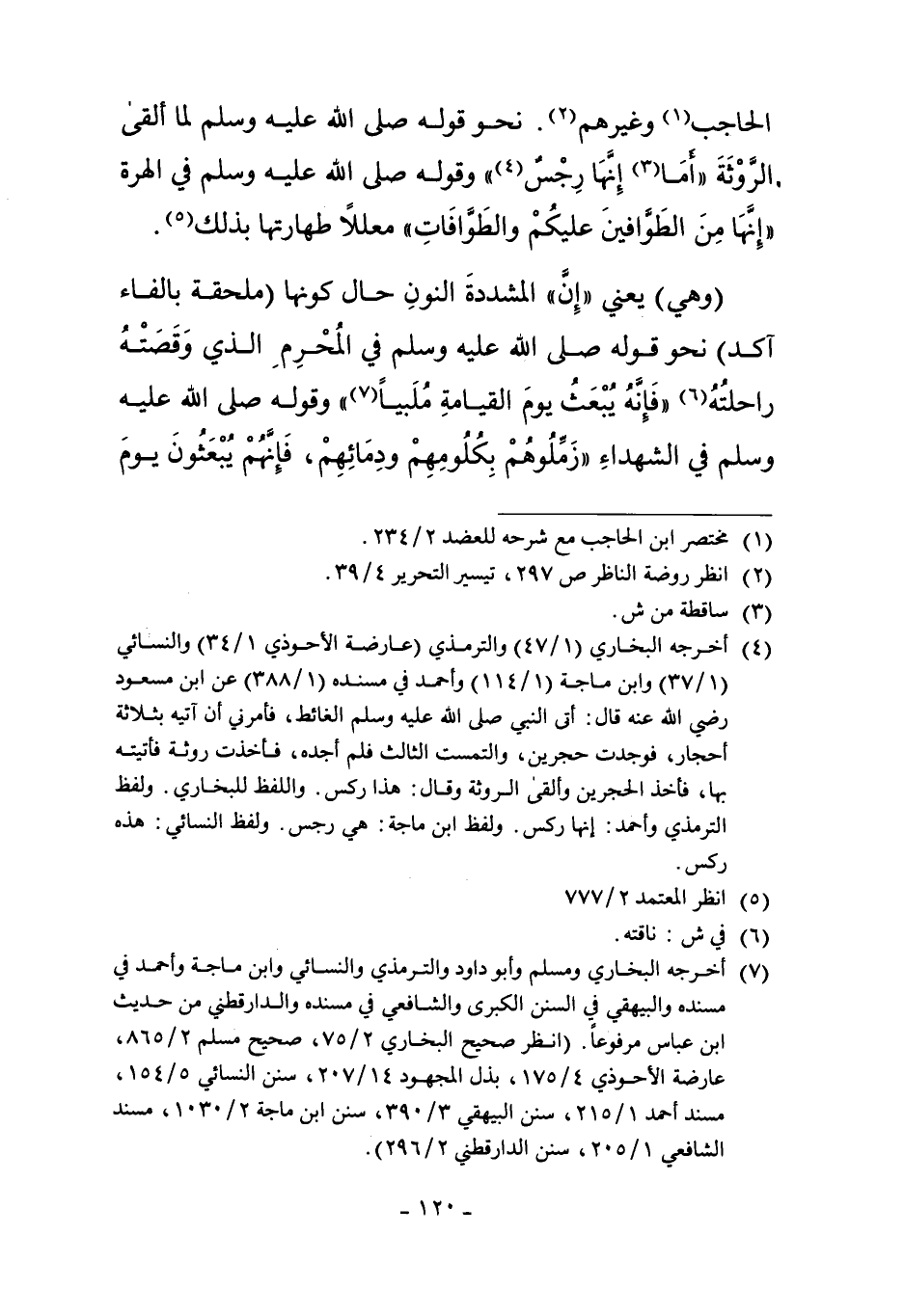 الْحَاجِبِ1 وَغَيْرِهِمْ2، نَحْوَ قَوْلِهِ صَلَّى اللَّهُ عَلَيْهِ وَسَلَّمَ لَمَّا أَلْقَى الرَّوْثَةَ أَمَا3 "إنَّهَا رِجْسٌ4" وَقَوْلِهِ صَلَّى اللَّهُ عَلَيْهِ وَسَلَّمَ فِي الْهِرَّةِ "إنَّهَا مِنْ الطَّوَّافِينَ عَلَيْكُمْ وَالطَّوَّافَاتِ" مُعَلِّلاً طَهَارَتَهَا بِذَلِكَ5.