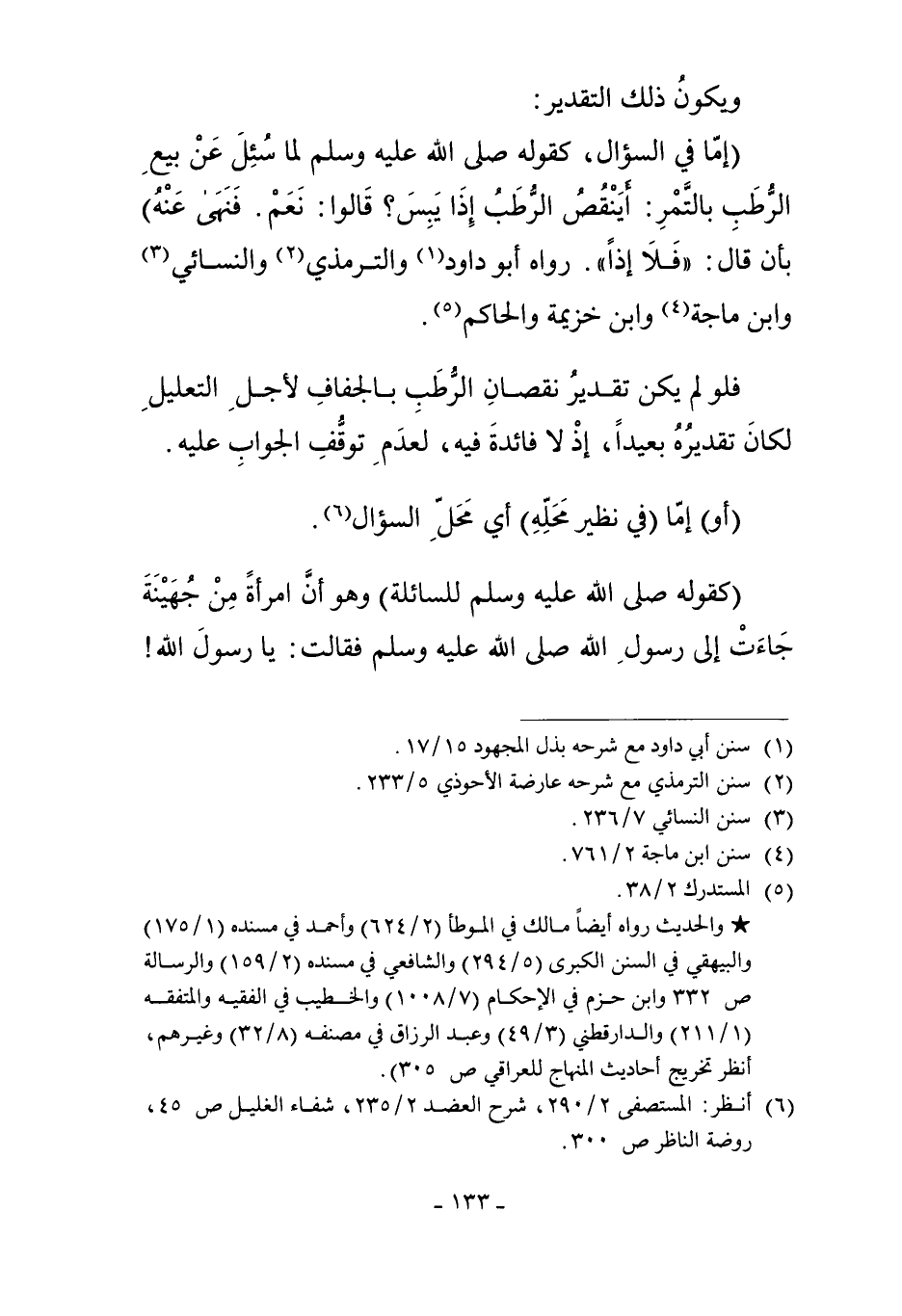 "إمَّا فِي السُّؤَالِ، كَقَوْلِهِ صَلَّى اللَّهُ عَلَيْهِ وَسَلَّمَ - لَمَّا سُئِلَ عَنْ بَيْعِ الرُّطَبِ بِالتَّمْرِ – "أَيَنْقُصُ الرُّطَبُ إذَا يَبِسَ؟ " قَالُوا: نَعَمْ فَنَهَى عَنْهُ" بِأَنْ قَالَ: "فَلا إذًا" رَوَاهُ أَبُو دَاوُد1 وَالتِّرْمِذِيُّ2 وَالنَّسَائِيُّ3 وَابْنُ مَاجَهْ4 وَابْنُ خُزَيْمَةَ وَالْحَاكِمُ5.