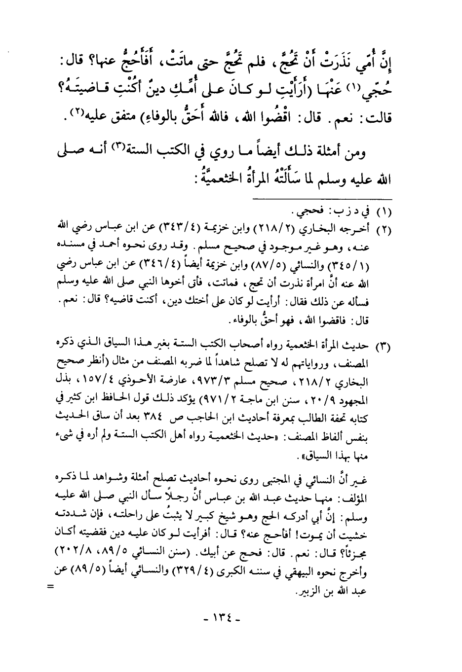 3 حديث المرأة الخثعمية رواه أصحاب الكتب الستة بغير هذا السياق الذي ذكره المصنف، ورواياتهم له لا تصلح شاهداً لما ضربه المصنف من مثال "أنظر صحيح البخاري 2/218، صحيح مسلم 3/973، عارضة الأحوذي 4/157، بذل المجهود 9/20، سنن ابن ماجة 2/971" ويؤكد ذلك قول الحافظ ابن كثير في كتابه تحفة الطالب بمعرفة أحاديث ابن الحاجب ص 384 بعد أن ساق الحديث بنفس ألفاظ المصنف: "حديث الخثعمية رواه أهل الكتب الستة ولم أره في شيء منها بهذا السياق".