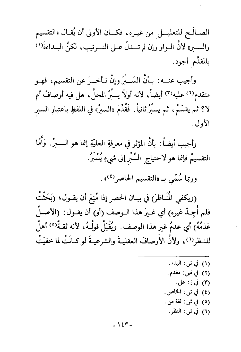 الصَّالِحَ لِلتَّعْلِيلِ مِنْ غَيْرِهِ، فَكَانَ الأَوْلَى أَنْ يُقَالَ: التَّقْسِيمُ وَالسَّبْرُ؛ لأَنَّ الْوَاوَ - وَإِنْ لَمْ تَدُلَّ عَلَى التَّرْتِيبِ - لَكِنَّ الْبُدَاءَةَ1 بِالْمُقَدَّمِ أَجْوَدُ.