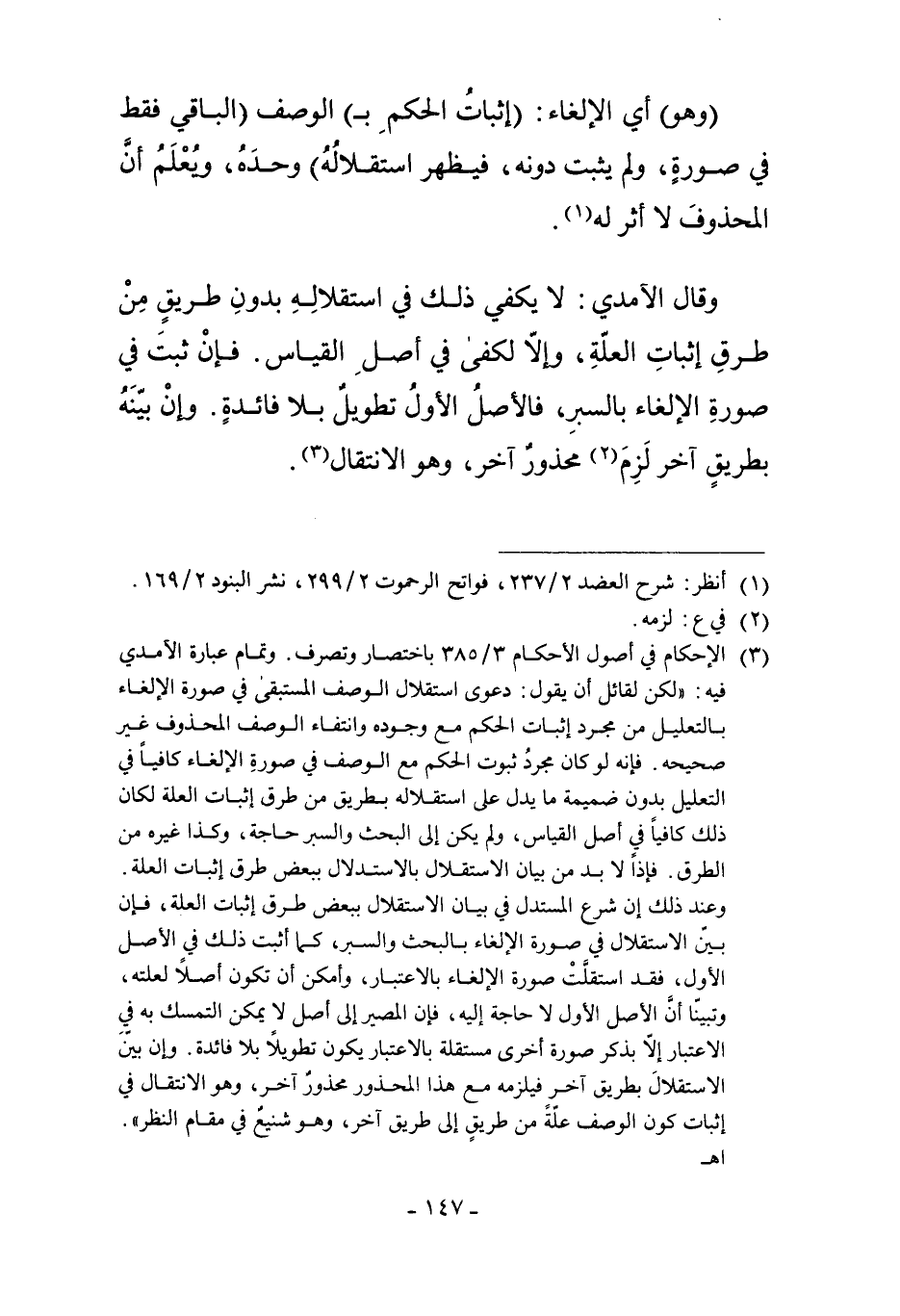 3 الإحكام في أصول الأحكام 3/385 باختصار وتصرف. وتمام عبارة الآمدي فيه: "لكن لقائل أن يقول: دعوى استقلال الوصف المستبقى في صورة الإلغاء بالتعليل من مجرد إثبات الحكم مع وجوده وانتفاء الوصف المحذوف غير صحيحه. فإنه لو كان مجرد ثبوت الحكم مع الوصف في صورة الإلغاء كافياً في التعليل بدون ضميمة ما يدل على استقلاله بطريق من طرق إثبات العلة لكان ذلك كافياً في أصل القياس، ولم يكن إلى البحث والسبر حاجة، وكذا غيره من الطرق. فإذاً لا بد من بيان الاستقلال ببعض طرق إثبات العلة. وعند ذلك إن شرع المستدل في بيان الاستقلال بالاستدلال ببعض طرق إثبات العلة.، فإن بيّن الاستقلال في صورة الإلغاء بالاعتبار، وأمكن أن تكون أصلاً لعلته، وتبينا أنّ الأصل الأول لا حاجة إليه، فإن المصير إلى أصل لا يمكن التمسك به في الاعتبار إلاّ بذكر صورة أخرى مستقلة بالاعتبار يكون تطويلاً بلا فائدة. وإن بين الاستقلال بطريق آخر فيلزمه مع هذا المحذور محذور آخر، وهو الانتقال في إثبات كون الوصف علة من طريقٍ إلى طريق آخر، وهو شنيع في مقام النظر". اهـ.