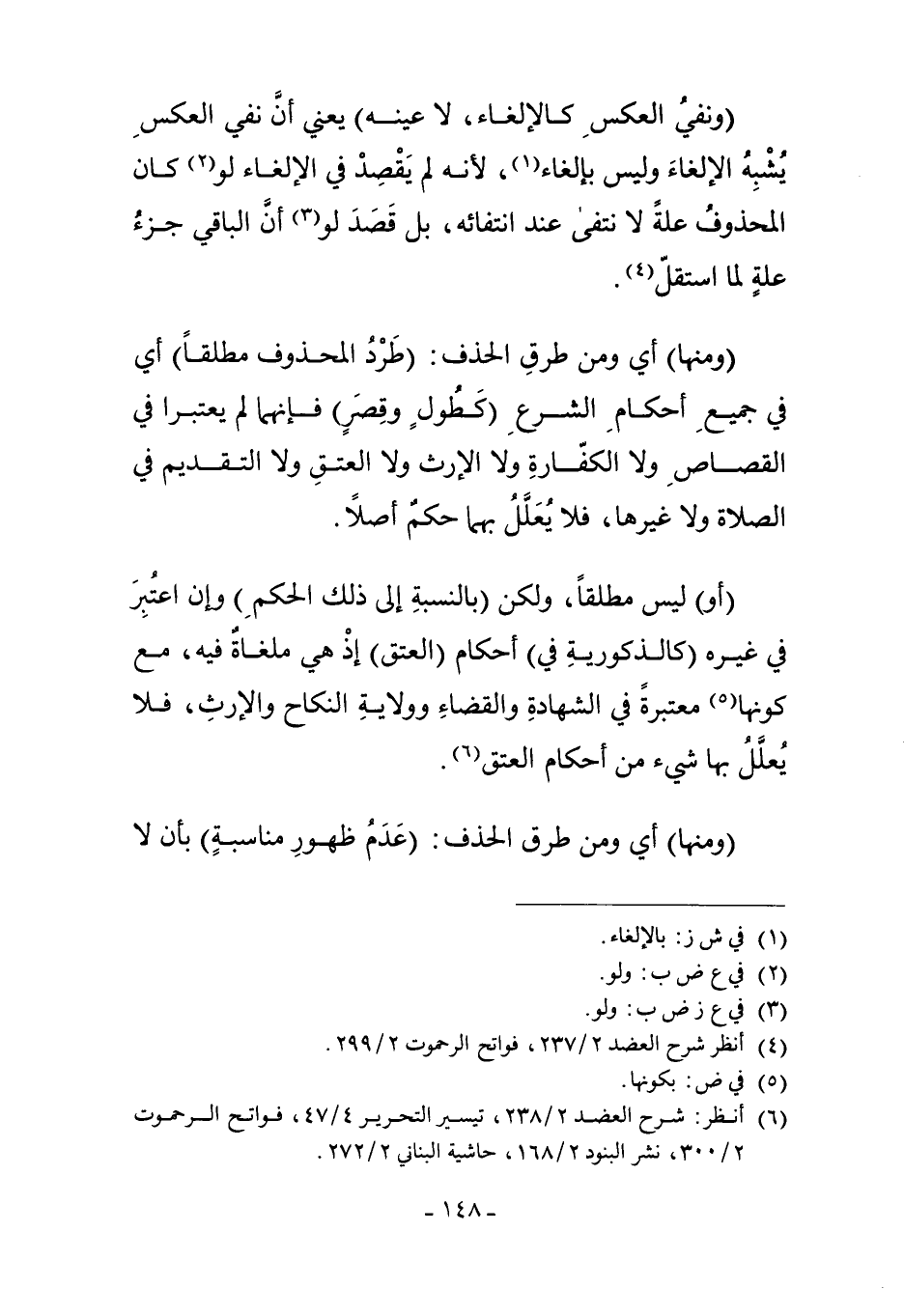 "وَنَفْيُ الْعَكْسِ كَالإِلْغَاءِ لا عَيْنِهِ" يَعْنِي: أَنَّ نَفْيَ الْعَكْسِ يُشْبِهُ الإِلْغَاءَ. وَلَيْسَ بِإِلْغَاءٍ1؛ لأَنَّهُ لَمْ يَقْصِدْ فِي الإِلْغَاءِ لَوْ2 كَانَ الْمَخْذُوفُ عِلَّةً لانْتَفَى عِنْدَ انْتِفَائِهِ، بَلْ قَصَدَ: لَوْ3 أَنَّ الْبَاقِيَ جُزْءُ عِلَّةٍ لَمَا اسْتَقَلَّ4.