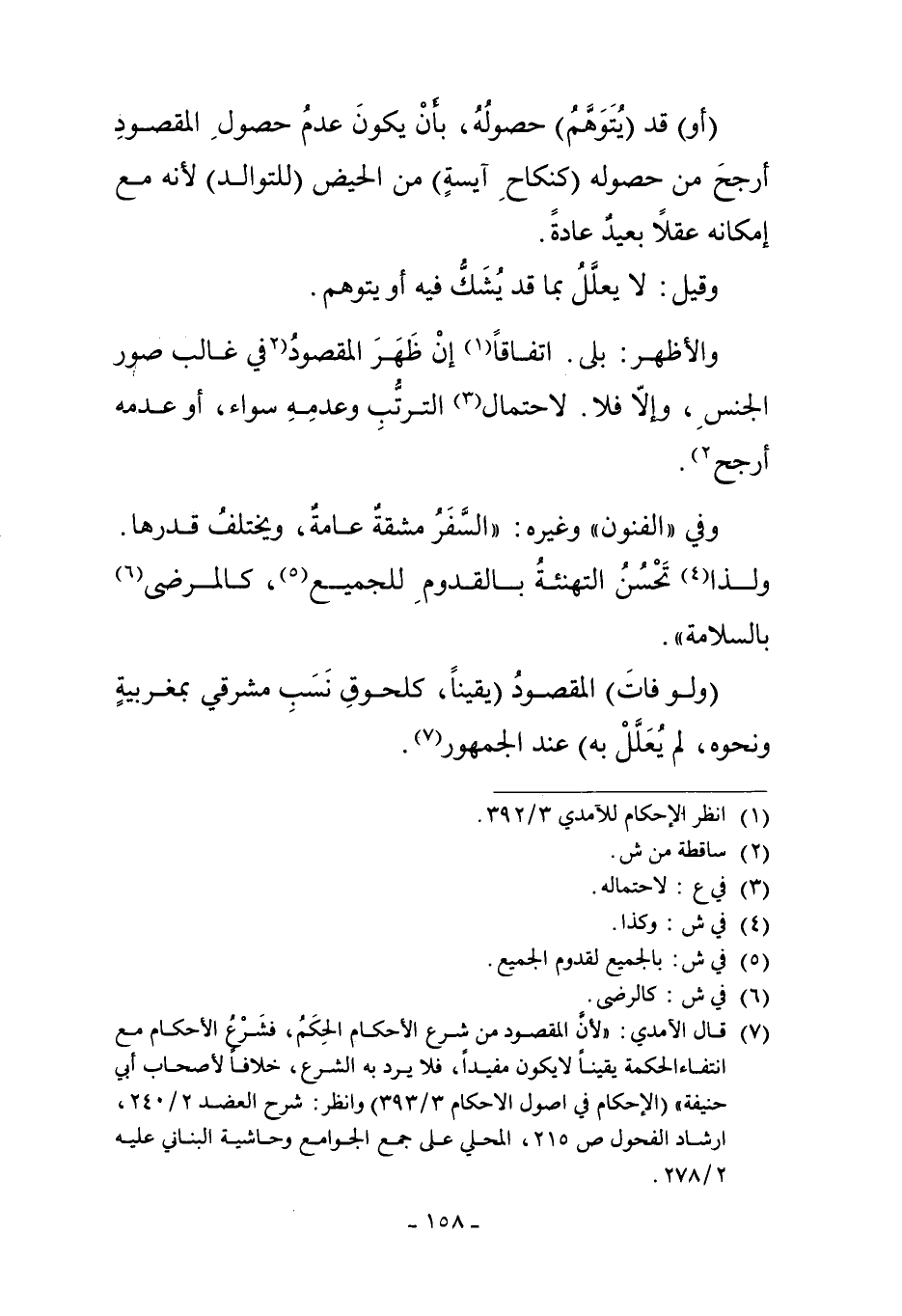 "وَلَوْ فَاتَ" الْمَقْصُودُ "يَقِينًا، كَلُحُوقِ نَسَبِ مَشْرِقِيٍّ بِمَغْرِبِيَّةٍ وَنَحْوِهِ لَمْ يُعَلَّلْ بِهِ" عِنْدَ الْجُمْهُورِ7.