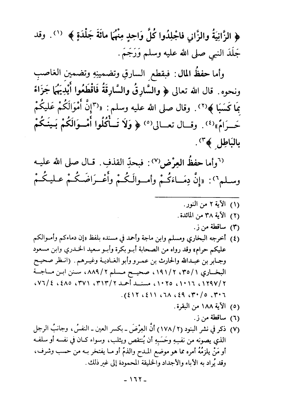 وَأَمَّا حِفْظُ الْمَالِ: فَبِقَطْعِ السَّارِقِ وَتَضْمِينِهِ وَتَضْمِينِ الْغَاصِبِ وَنَحْوِهِ. قَالَ اللَّهُ تَعَالَى: {وَالسَّارِقُ وَالسَّارِقَةُ فَاقْطَعُوا أَيْدِيَهُمَا جَزَاءً بِمَا كَسَبَا} 2 وَقَالَ صَلَّى اللَّهُ عَلَيْهِ وَسَلَّمَ "3إنَّ أَمْوَالَكُمْ عَلَيْكُمْ حَرَامٌ" 4 وَقَالَ تَعَالَى: 5 {وَلا تَأْكُلُوا أَمْوَالَكُمْ بَيْنَكُمْ بِالْبَاطِلِ} .