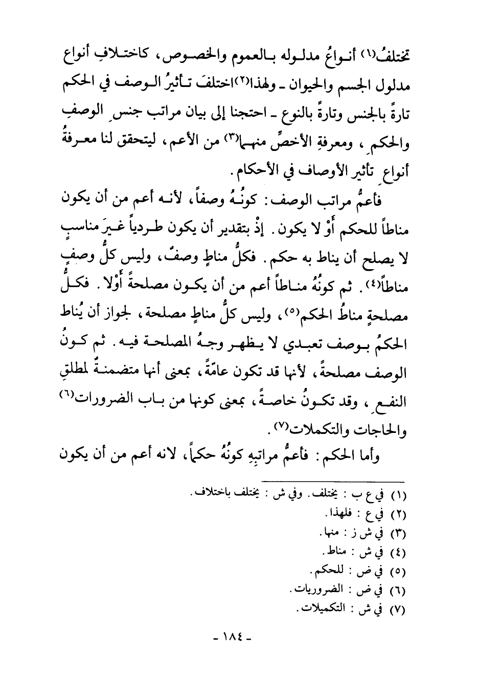 فَأَعَمُّ مَرَاتِبِ الْوَصْفِ: كَوْنُهُ وَصْفًا؛ لأَنَّهُ أَعَمُّ مِنْ أَنْ يَكُونَ مَنَاطًا لِلْحُكْمِ أَوْ لا يَكُونَ، إذْ بِتَقْدِيرِ أَنْ يَكُونَ طَرْدِيًّا غَيْرَ مُنَاسِبٍ لا يَصْلُحُ أَنْ يُنَاطَ بِهِ حُكْمٌ، فَكُلُّ مَنَاطٍ وَصْفٌ، وَلَيْسَ كُلُّ وَصْفٍ مَنَاطًا4، ثُمَّ كَوْنُهُ مَنَاطًا: أَعَمُّ مِنْ أَنْ يَكُونَ مَصْلَحَةً أَوْ لا. فَكُلُّ مَصْلَحَةٍ مَنَاطُ الْحُكْمِ5، وَلَيْسَ كُلُّ مَنَاطٍ مَصْلَحَةً، لِجَوَازِ أَنْ يُنَاطَ الْحُكْمُ بِوَصْفٍ تَعَبُّدِيٍّ، لا يَظْهَرُ وَجْهُ الْمَصْلَحَةِ فِيهِ، ثُمَّ كَوْنُ الْوَصْفِ مَصْلَحَةً: لأَنَّهَا قَدْ تَكُونُ عَامَّةً، بِمَعْنَى أَنَّهَا مُتَضَمِّنَةٌ لِمُطْلَقِ النَّفْعِ. وَقَدْ تَكُونُ خَاصَّةً، بِمَعْنَى كَوْنِهَا مِنْ بَابِ الضَّرُورَاتِ6 وَالْحَاجَاتِ وَالتَّكَمُّلاتِ7.