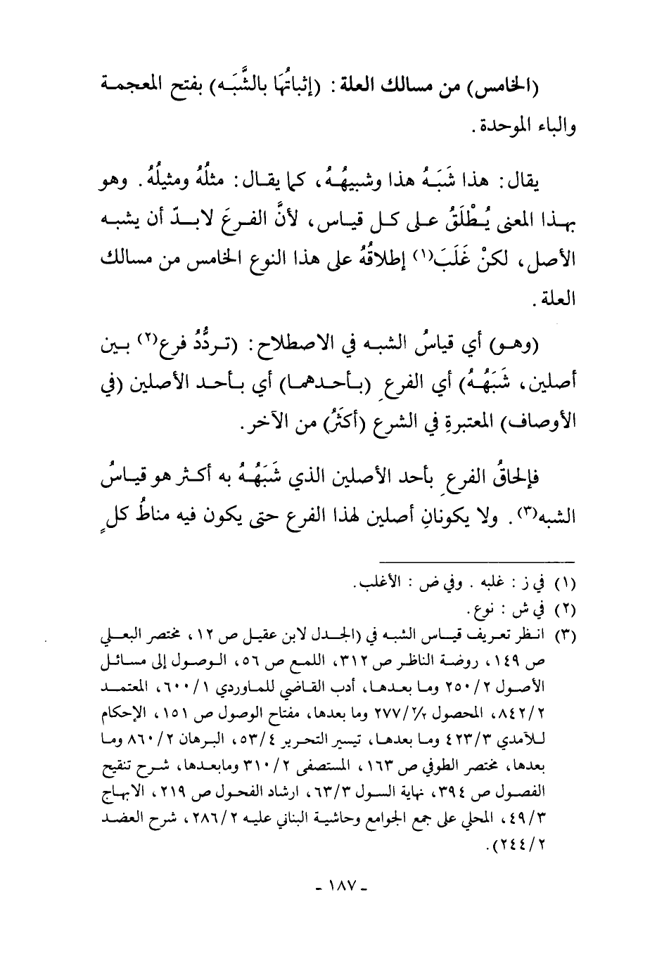 3 انظر تعريف قياس الشبه في "الجدل لابن عقيل ص 12، مختصر البعلي ص 149، روضة الناظر ص 312، اللمع ص 56، الوصول إلى مسائل الأصول 2/250 وما بعدها، أدب القاضي للماوردي 1/600، المعتمد 2/842، المحصول 2/2/277 وما بعدها، مفتاح الوصول ص 151، الإحكام للآمدي 3/423 وما بعدها، تيسير التحرير 4/53، البرهان 2/860 وما بعدها، مختصر الطوفي ص 163، المستصفى 2/310 وما بعدها، شرح تنقيح الفصول ص 394، نهاية السول 3/63، ارشاد الفحول ص 219، الابهاج 3/49، المحلي على جمع الجوامع وحاشية البناني عليه 2/286، شرح العضد 2/244".